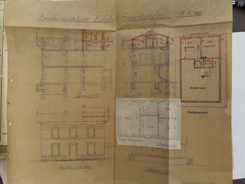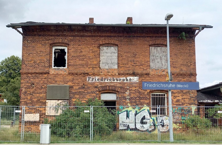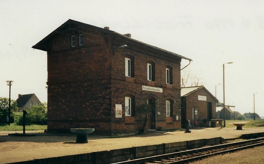 am westlichen Dorfrand. Bereits im Plan von 1900 ist eine Feldbahn vom Gutshof Friedrichsruhe eingezeichnet. Das seit fast 30 Jahren leerstehende Gebäude hat bisher leider keinen neuen Eigentümer und verfällt zusehends. Mit der Streckenerneurung nach 2010 wurde der Bahnsteig neu gebaut. |