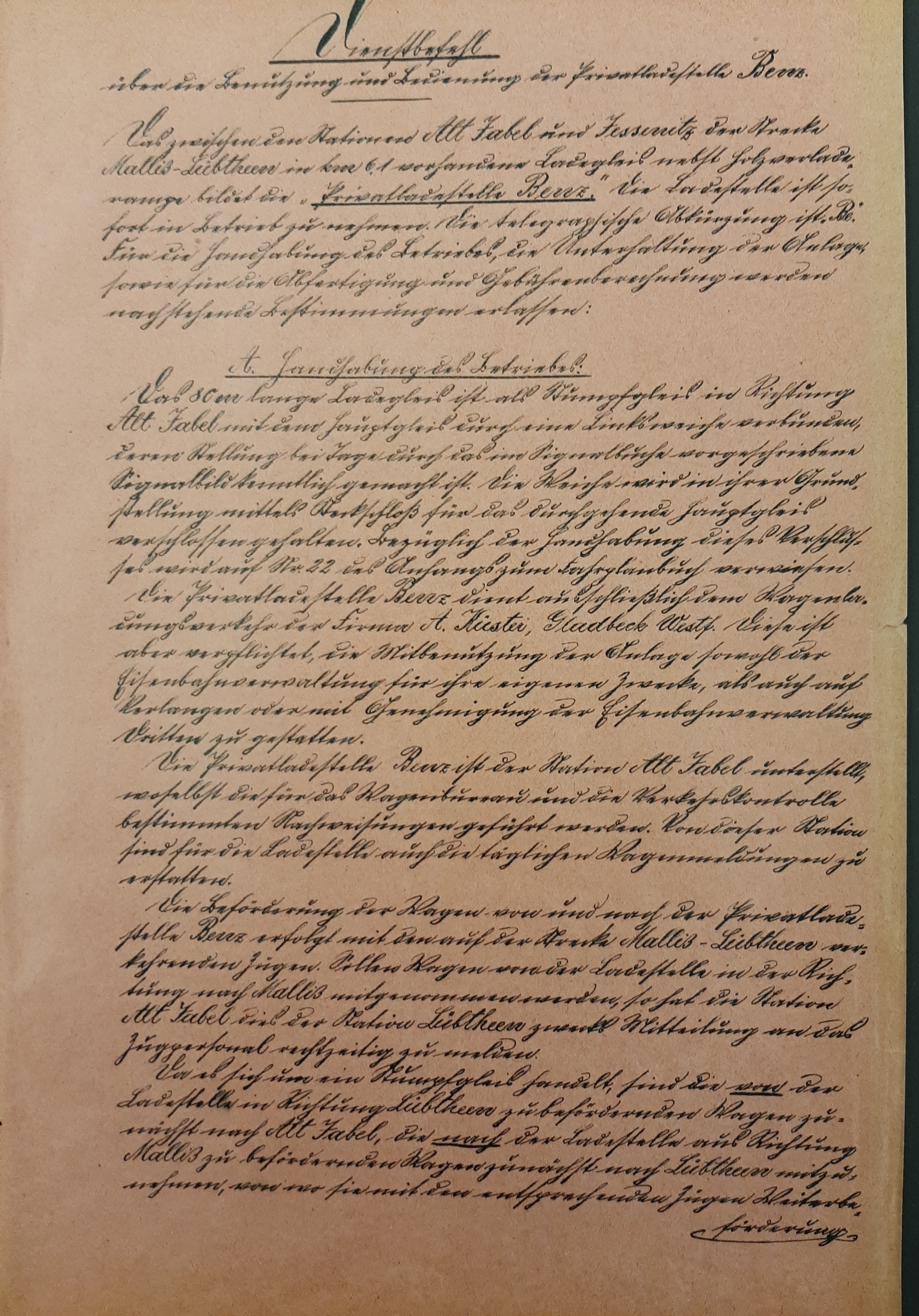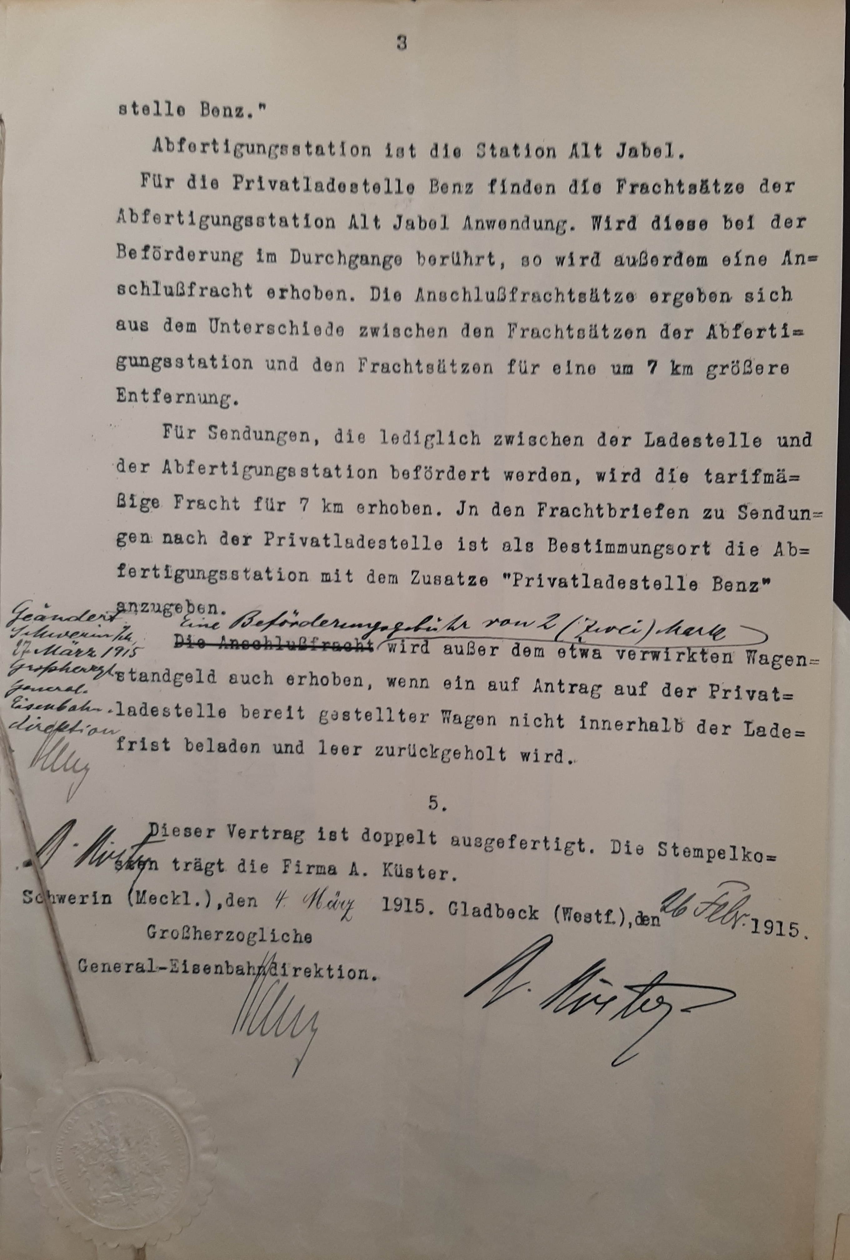 Benz erlassen:   "Dienstbefehl über die Benutzung und Bedienung der Privatladestelle Benz.   Das zwischen den Stationen Alt Jabel und Jessenitz der Strecke Malliß-Lübtheen in km 6,1 vorhandene Ladegleis nebst Holzverladerampe bildet die "Privatladestelle Benz." Die Ladestelle ist sofort in Betrieb zu nehmen. Die telegraphische Abkürzung ist "Be". Für die Handhabung des Betriebes, die Unterhaltung der Anlage, sowie für die Abfertigung und Gebührenerhebung werden nachstehende Bestimmungen erlassen: A. Handhabung des BetriebesDas 80 m lange Ladegleis ist als Stumpfgleis in Richtung Alt Jabel mit dem Hauptgleis durch eine Linksweiche verbunden, deren Stellung bei Tage durch das im Signalbuche vorgeschriebene Signalbild kenntlich gemacht ist. Die Weiche wird in Ihrer Grundstellung mittels Steckschloß für das durchgehende Hauptgleis verschlossen gehalten. Bezüglich der Handhabung dieses Verschlusses wird auf Nr. 22 des Anhangs zum Fahrplanbuch verwiesen. Die Privatladestelle Benz dient ausschließlich dem Wagenladungsverkehr der Firma A. Küster, Gladbeck Westf. Diese ist aber verpflichtet, die Mitbenutzung der Anlage sowohl der Eisenbahnverwaltung für ihre eigenen Zwecke, als auch auf Verlangen oder mit Genehmigung der Eisenbahnverwaltung zu gestatten. Die Privatladestelle Benz ist der Station Alt Jabel unterstellt, woselbst die für das Wagenbureau und die Verkehrskontrolle bestimmten Nachweisungen geführt werden. Von dieser Station sind für die Ladestelle auch die täglichen Wagenmeldungen zu erstatten. Die Beförderung der Wagen von und nach der Privatladestelle Benz erfolgt mit den auf der Strecke Malliß-Lübtheen verkehrenden Zügen. Sollen Wagen von der Ladestelle in der Richtung nach Malliß mitgenommen werden, so hat die Station Alt Jabel dies der Station Lübtheen zwecks Mitteilung an das Zugpersonal rechtzeitig zu melden. Da es sich um ein Stumpfgleis handelt, sind die von der Ladestelle in Richtung Lübtheen zu befördernden Wagen zunächst nach Alt Jabel, die nach der Ladestelle aus Richtung Malliß zu befördernden Wagen zunächst nach Lübtheen mitzunehmen, von wo aus sie mit den entsprechenden Zügen Weiterbeförderung finden. Über die auf der Ladestelle ausgesetzten Wagen von dem betreffenden Zugführer der Station Alt Jabel unter Angabe der Wagennummer und Abgabe der Begleitpapiere Meldung zu erstatten. Beim Ein- und Aussetzen von Wagen hat das Zugpersonal den Rangierdienst zu versehen. Eine besondere Bewachung der Ladestelle findet nicht statt, ebensowenig eine Beleuchtung der Weiche während der Dunkelheit. B. Unterhaltung der AnlageDas Anschlußgleis nebst Weiche und Laderampe sind Eigentum der Firma A. Küster. Das Ladegleis nebst Weiche sind eisenbahnseitig aber auf Kosten der Firma zu unterhalten. Die Laderampe unterhält die Firma selbst. Die Ladestelle gehört zum Dienstbereich der Bahnmeisterei 40 in Lübtheen. Die Reinigung der Weiche hat der Bahnwärter zu besorgen. C. Abfertigung der Sendungen und Gebührenberechnung.Abfertigungsstation für die Ladestelle Benz ist die Station Alt Jabel. Diese hat alle mit der Abfertigung der Sendungen von und nach Benz verbundenen Geschäfte nach den bestehenden V orschriften auszuführen. Für die Ladestelle gelten die Frachtsätze der Abfertigungsstation. Für Sendungen in oder aus der Richtung Malliß wird außerdem eine Anschlußfracht erhoben. Die Anschlußfrachtsätze ergeben sich aus dem Unterschied zwischen den Frachtsätzen der Station Alt Jabel und den Frachtsätzen für eine um 7 km höhere Entfernung. Für Sendungen, die lediglich zwischen der Ladestelle und der Abfertigungsstation befördert werden, wird die tarifmäßige Fracht für 7 km erhoben. Für leere Wagen, die der Ladestelle zu Beladung zugeführt, aber nicht beladen und leer zurückgeholt werden, ist außerdem etwa verwirkten Wagenstandgelde eine Beförderungsgebühr von 2 M für den Wagen zu erheben. Im Übrigen wird auf die Vorbemerkungen der "Übersicht der Privatanschlüsse" hingewiesen.   Schwerin, den 20. März 1915 Großherzogliche Generaldirektion   [Liste der Empfänger]" |