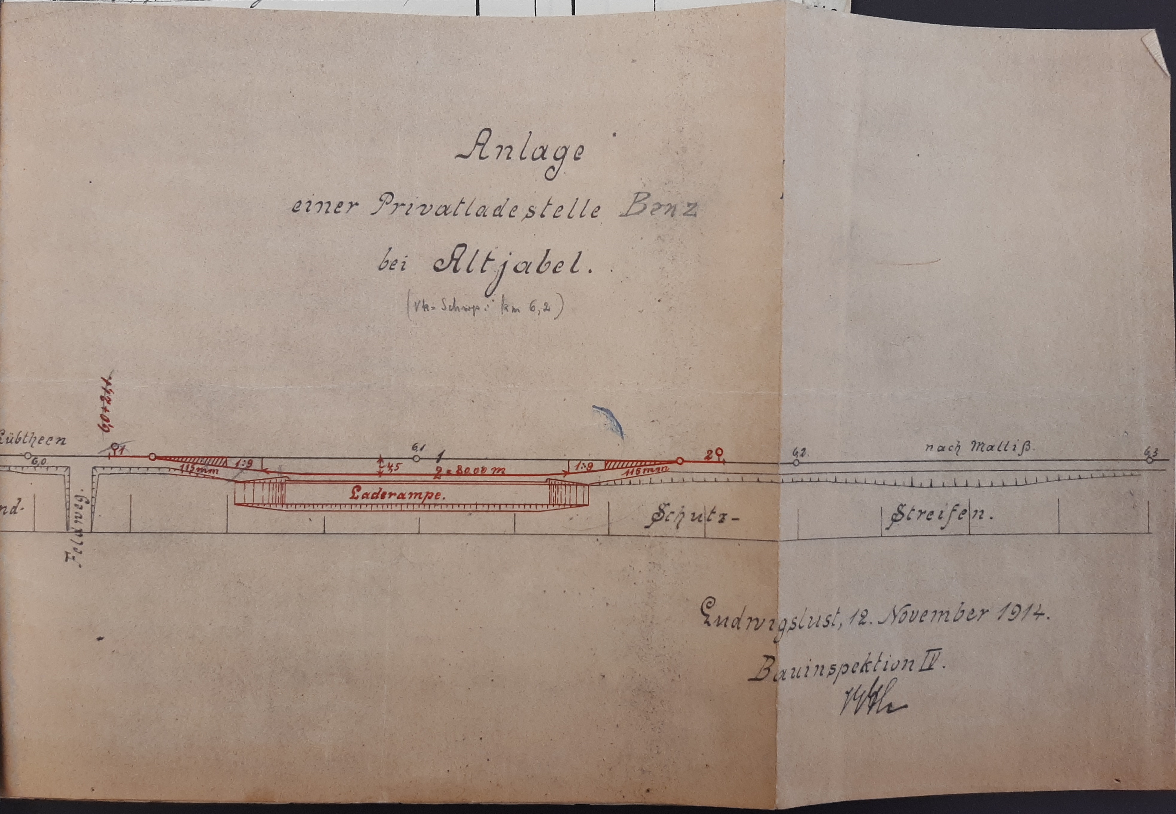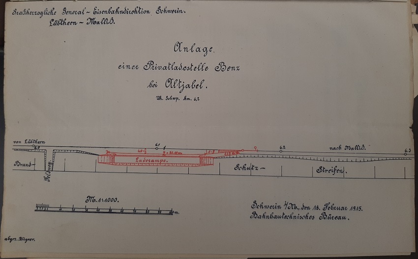 | 1914 teilte die Firma Küster aus Gladbeck in Westfahlen (Holzhandlung und Dampfsägewerk) der Direktion der Mecklenburgischen Friedrich-Franz-Eisenbahn (Großherzogliche General-Eisenbahndirektion) mit, dass er sie den gesamten Holzbestand des Rittergutes Benz bei Alt Jabel erworben hat. Rund 4.000 Wagenladungen würden zum Versand kommen. Dafür wäre eine Verladestelle zwischen den Stationen Lübtheen und Alt Jabel erforderlich sein. Man bat die Bahn darum, eine solche Verladestelle schnellstens in km 6,1 auf Kosten der Bahn für vier bis fünf Jahre Nutzzeit anlegen zu lassen. Die Nutzlänge müsste rund 80 m betragen. Aber man könne von einer dauerhaften Nutzung des Gleises ausgehen, da es auch vom Rittergut selbst genutzt werden könnte. Die Bahn lehnte den Bau auf ihre Kosten ab, würde das Anschlussgleis jedoch auf Kosten des Antragstellers zu den allgemeinen Bedingungen für Privatanschlussgleise errichten. Ergänzt wurde der ursprüngliche Antrag um die Bitte zur Errichtung einer Seitenrampe, um auch Langholz verladen zu können. Die Bahn plant daraufhin ein Anschlussgleis mit Rampe parallel zum Streckengleis. |
