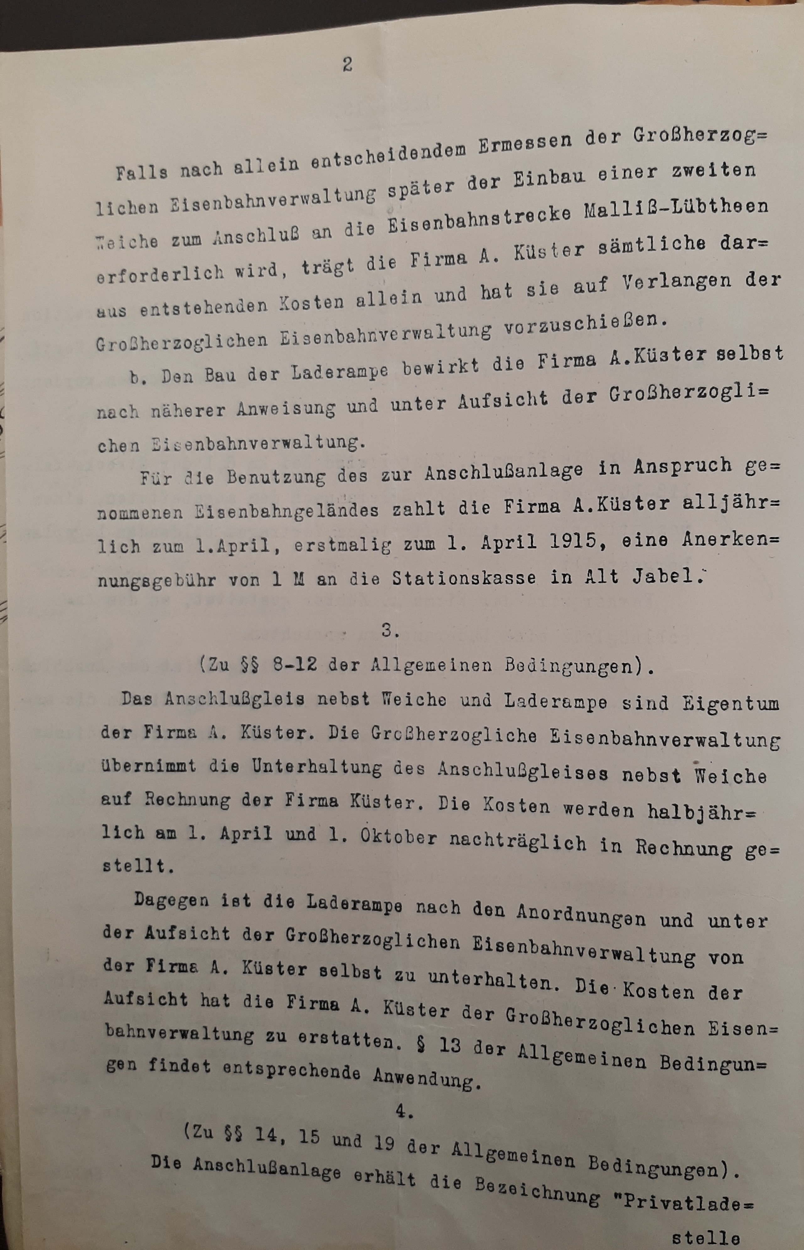 damit die Anfahrwege so kurz wie möglich sind. Daraufhin fand ein von der Firma gewünschter Besprechungstermin mit der Bauinspektion IV Ludwigslust statt. Dabei ergab sich, dass das Gleis nur einseitig aus Richtung Alt Jabel angebunden werden muss. Sonst sei gegen den Entwurf nichts einzuwenden. Abfertigungsstation sollte Alt Jabel werden.   Im Dezember des gleichen Jahres teile die Firma der G.G.D. mit, dass sie sich mit dem Bau in der abgestimmten Version einverstanden erklärte und bat darum, die zweite Weiche vorerst nicht einzubauen, weil die Holznachfrage nicht so groß ist, wie ursprünglich angenommen. Außerdem sollte eine gebrauchte Weiche mit einer Neigung von 1:7, die die Firma besorgt hatte eingebaut werden. Sie sollte den Ansprüchen genügen. Die geplante Weiche (Neigung 1:9) sei nicht erforderlich, sofern sie den Normalien der Preußischen Staatsbahn entspricht. Die Firma erklärte sich auch bereit, die Frachtsätze ab dem Bahnhof Jessenitz zu entrichten. Die Abfertigung und Leerwagenbestellungen sollten jedoch vom Bahnhof Alt Jabel aus erfolgen, da der zuständige Firmenvertreter dort wohnte. Der Bau des Privatanschlusses sollte möglichst beschleunigt werden.   Am 28. Dezember 1914 erklärte sich die Firma schriftlich mit den aufgestellten Bedingungen einverstanden und teilte mit, dass der verlangte Kostenvorschuss i.H.v. 7.100 Mark bereits an die Großherzogliche Eisenbahnhauptkasse überwiesen wurde. Die Firma bat nochmals "… zu veranlassen, dass mit den Herstellungsarbeiten der Anschlussanlage möglichst bald begonnen und diese, soweit die Witterungsverhältnisse es eben gestatten, raschestens zu Ende geführt werden.".   Am 4. März 1915 wird der Anschlussvertrag geschlossen. |