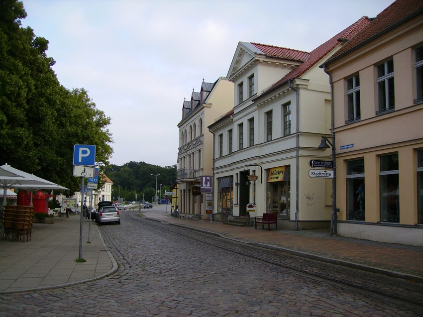 verläuft. Der Zug hält unmittelbar am Doberaner Hof, der Bäckerei Sparre, dem Café Zicke und dem
