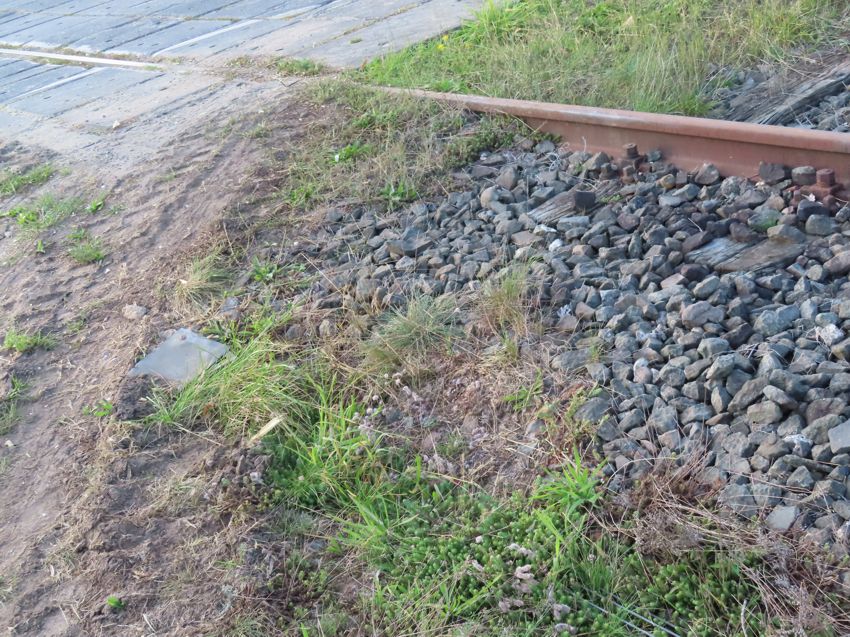| Das Gleis 1 ist in seiner gesamten Länge verkrautet, außer auf einem kleinen Stück vor