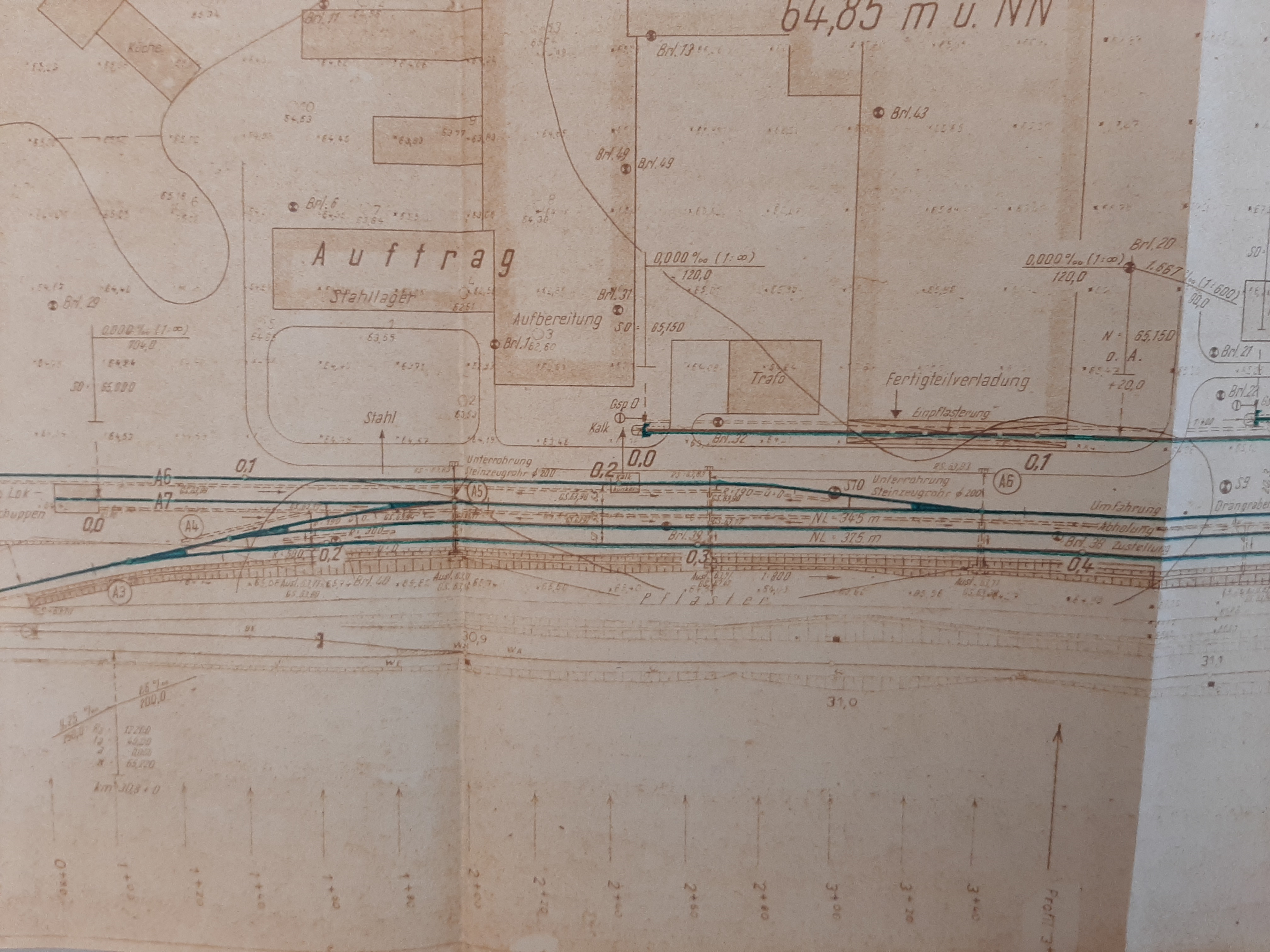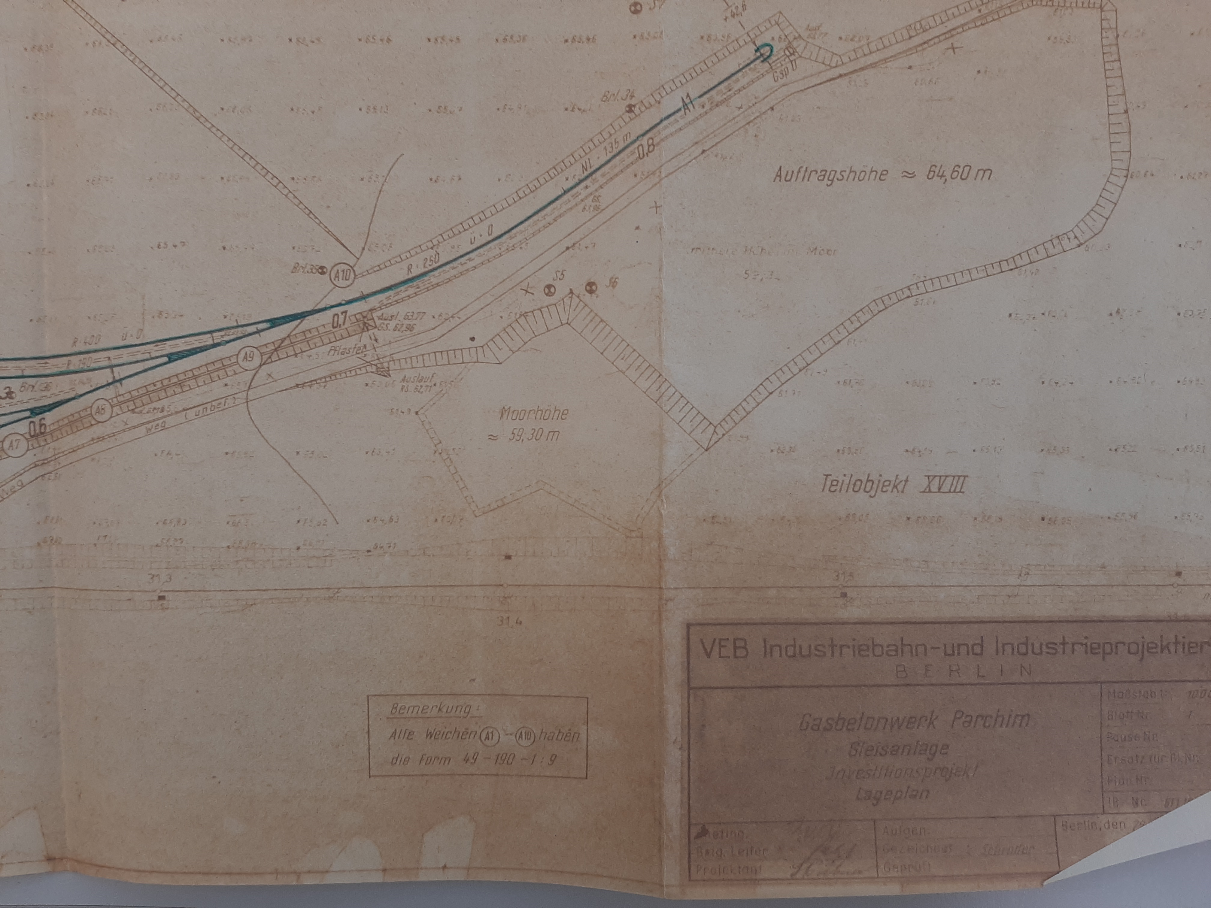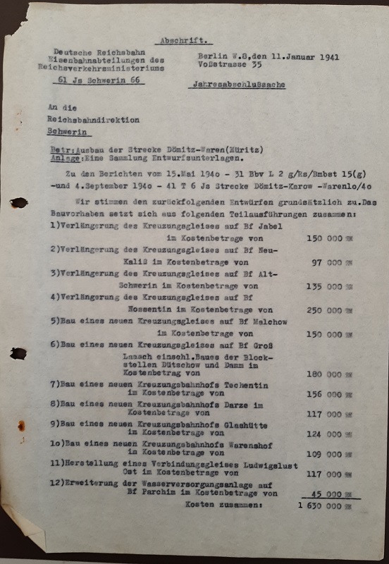 verbaut. Hinzu kamen ein Zungenriegel und insgesamt 3 Weichenhebel. Den Unterlagen zu Folge wurden, entgegen des Lageplanes, keine Einfahrvorsignale aufgestellt. Beide Stellwerke waren durch Bahnhofsblock miteinander verbunden. Es gab 6 Befehlsfelder, 4 Zustimmungsfelder und 2 Fahrstraßenfelder. Somit gab es insgesamt 12 besetzte Blocksperrenplätze. Nur für die Sicherungs- und Fernemeldetechnik wurden 46.500 RM veranschlagt. Das Kreuzungsgleis hatte eine Länge von 600 Metern.   Nach Kriegsende wurde der Bahnhof 1946 als Kriegsreparatin abgebaut. Das betraf auch die Weiche zum Anschlussgleis. Erst 1948 wurde diese wieder an der ursprünglichen Stelle in das Streckengleis eingebaut.   Im April 1952 übernimmt die VdgB BHG Stralendorf den Anschluss, doch bereits im November musste das Gleis wegen schlechtem Zustand gesperrt werden. Daraufhin wurde das Gleis anscheinend wieder Instand gesetzt und konnte bis 1958 wieder genutzt werden.   Als das Gleis 1958 erneut gesperrt werden und der Anschlieer trat vom Vertrag zurück.   1960/61 wurde der Bau einer neuen Anschlussbahn für das geplante oder bereits im Bau befindliche VEB Gasbetonwerk Parchim genehmig, das 1964 die Produktion aufnahm. Anfangs wurden Porenbetonplatten für den Plattenwohnungsbau gefertigt, später auch die bekannten Gasbetonsteine. Die Anschlussbahn wurde in km 30,663 an das Streckengleis angeshlossen. Die Endabnahme erfolgte 1963, also rechtzeitig zum Produktionsbeginn. |