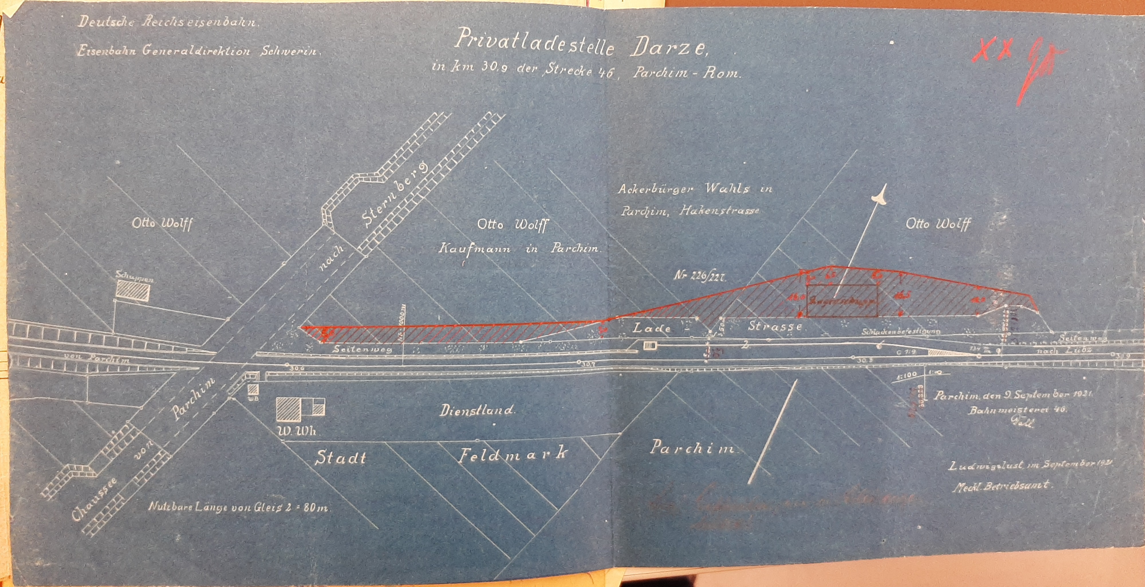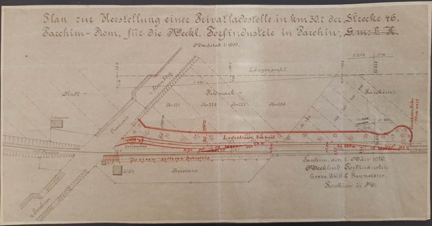 Vorspannlok fahren. Wegen der Anbindung der Ladestelle müsste die Lokomotive die Wagen von Darze nach Parchim schieben. Das konnte zugelassen werden, weil die Überwege in km 27,3 und 30,6 bewacht waren.   Am 10. August 1921 berichtet die Zuckerfabrik Lübz an die Schweriner Generaldirektion der Eisenbahn, dass der Gleisanschluss fertig ist und abgenommen werden könne. Außerdem bat man zur Inbetriebsetzung "noch um Genehmigung folgender Punkte: 1. Die Wagenanforderungen müssen an die Station Parchim gehen. 2. Ebenso darf der Bahnwärter an der Weiche Wagenladungen entgegennehmen und weitermelden."   Am 18 August erließ Schwerin den zugehörigen Dienstbefehl. |