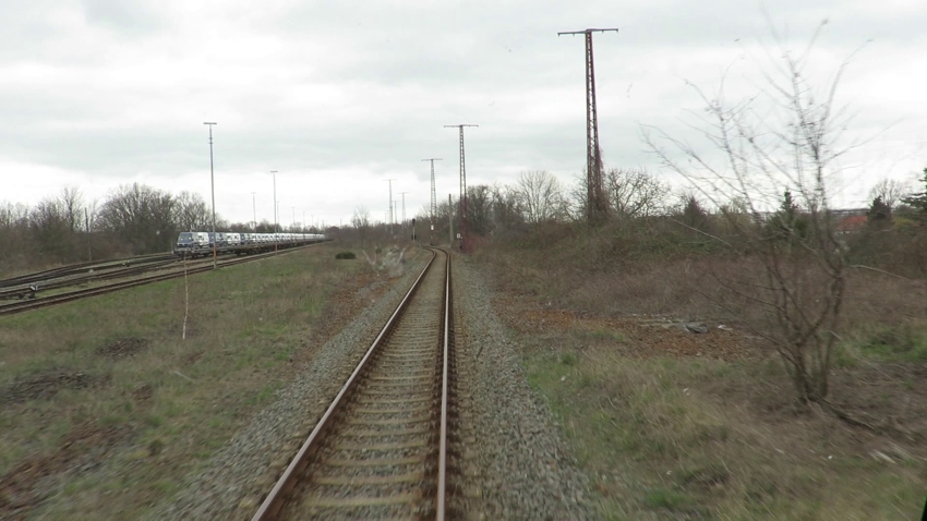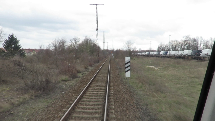 | Fahrt in Richtung Personenbahnhof; links der ehmalige Wasserturm des Rbf, rechts das Gelände des einstigen Rbf mit dem KV- und Containerterminal |