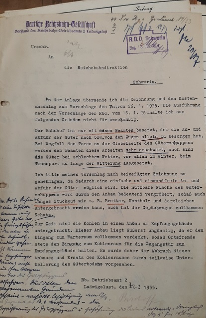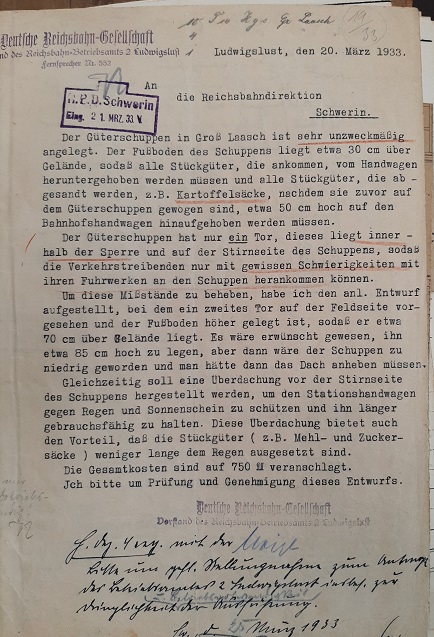 1933 bemängelte das Reichsbahn-Betriebsamt 2 Ludwigslust den unzweckmäßig angelegten Güterschuppen.   |