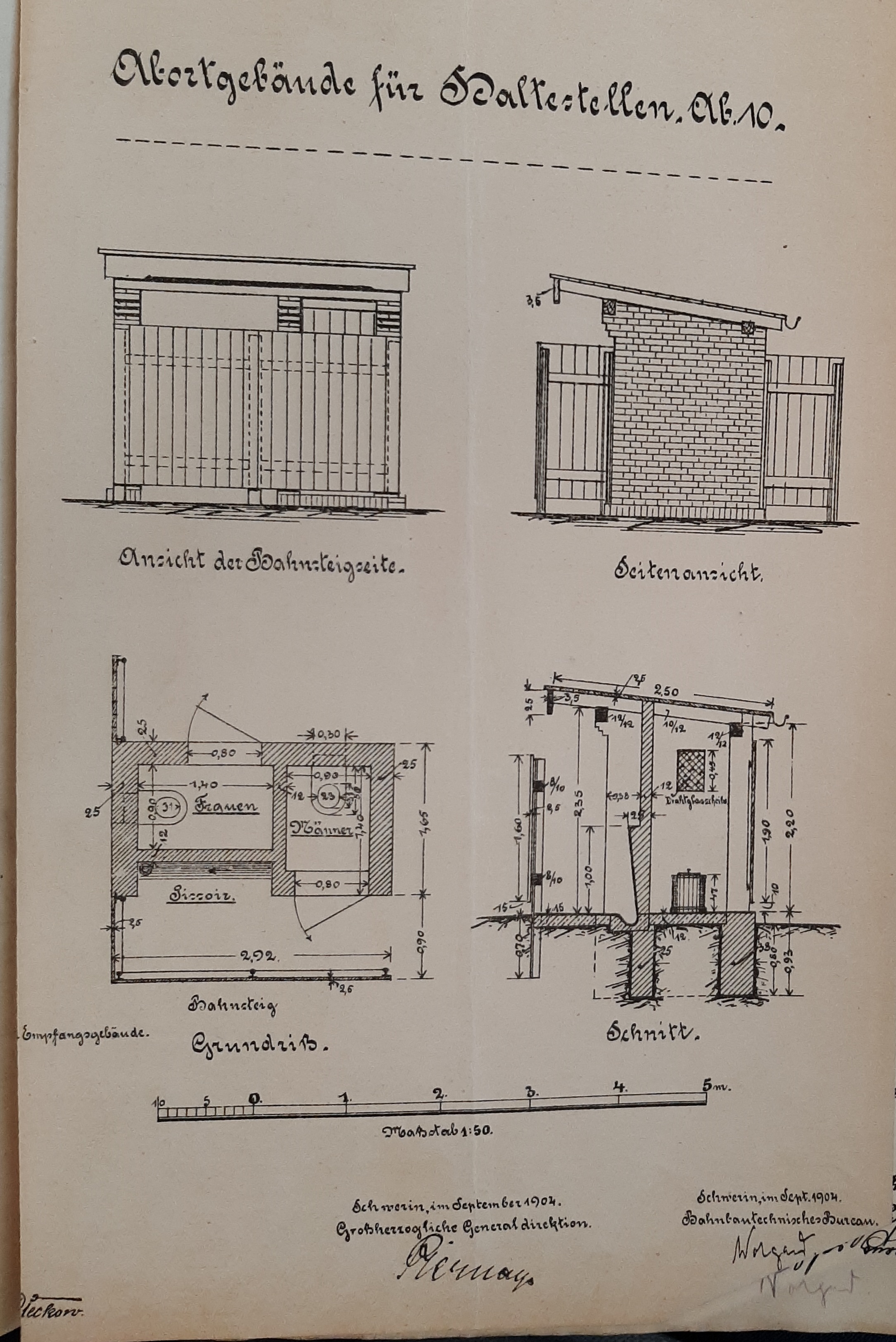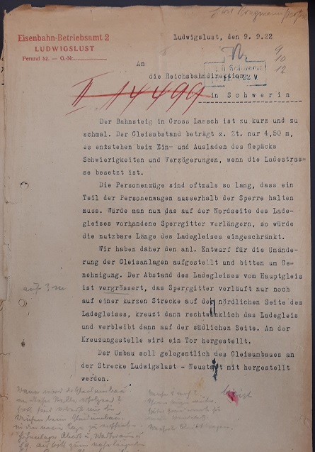 Stationsgebäude seinerzeit nicht groß genug war. Ein Jahr später beklagte die Gemeinde nochmals den Zustand. Daraufhin wurde die Einrichtung des Warteraumes abgelehnt, weil nur 388 Fahrkaarten II. Klasse im vergangenen Jahr verkauft wurden. Darauf antwortete die Gemeinde, dass es nur nur um die Anzahl der verkauften Fahrkarten gehen sollte, sondern um die Berücksichtigung der gesellschaftlichen Stellung der Reisenden II. Klasse.   1910 bemängelt die Bauinspektion IV in Ludwigslust mit einem Schreiben an die Eisenbahndirektion, dass der Bahnsteig mit 45 Metern Länge inzwischen zu kurz ist, da die Personenzüge 80 Meter und länger sind. Es kam schon vor, dass Personen aus den Wagen hinter dem Baahnübergang ausgestiegen sind und der Gefahr ausgesetzt waren, in den Bahngraben zu fallen. Es wurde vorgeschlagen, den Bahnsteig auf der Parchimer Seite um 50 Meter zu verlängern mit einer Breite von 3 Metern. 1911 wurde der Bahnsteig entsprechend verlängert.   |