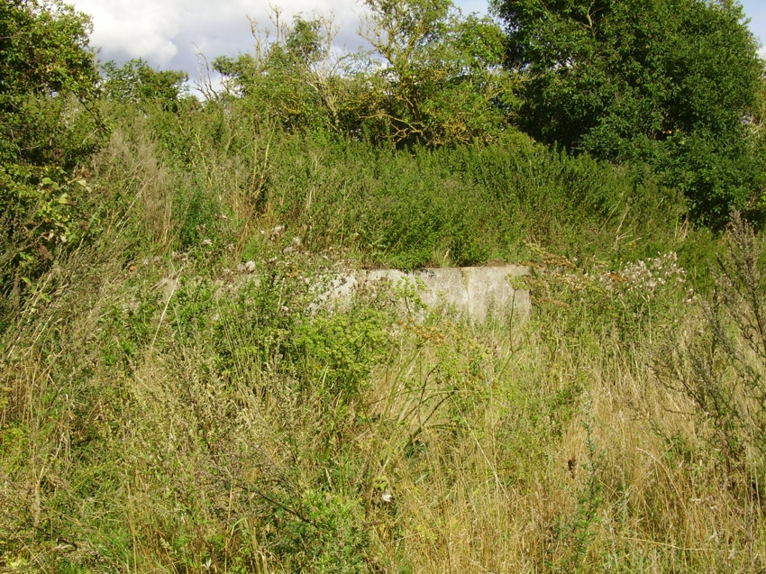 Grimmen. Der Feldweg war die Trasse (rechts des Gestrüpphaufens). Links an der Rampe lag das Ladegleis. |