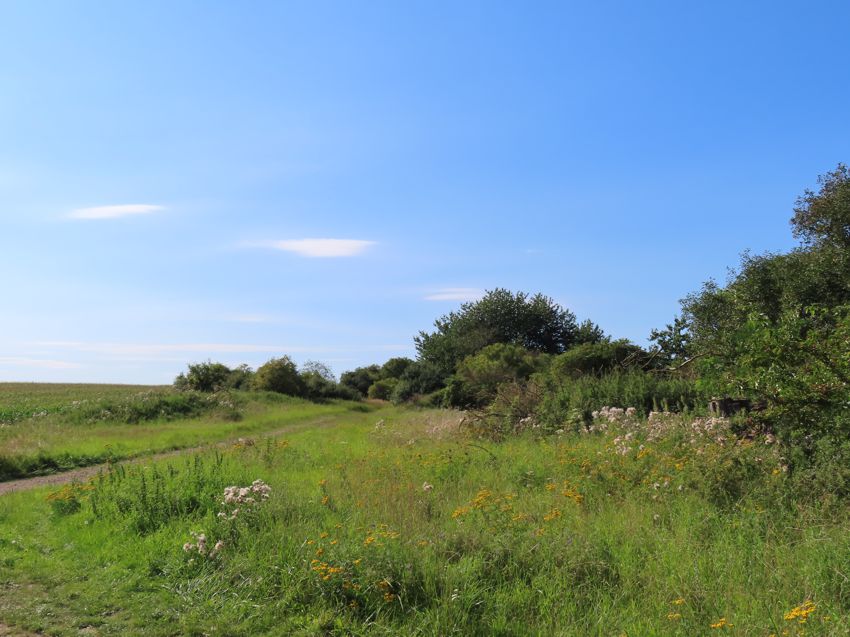 | Blick in Richtung Tribsees; Der Feldweg kreuzt etwas weiter hinten die einstige Bahntrasse. |