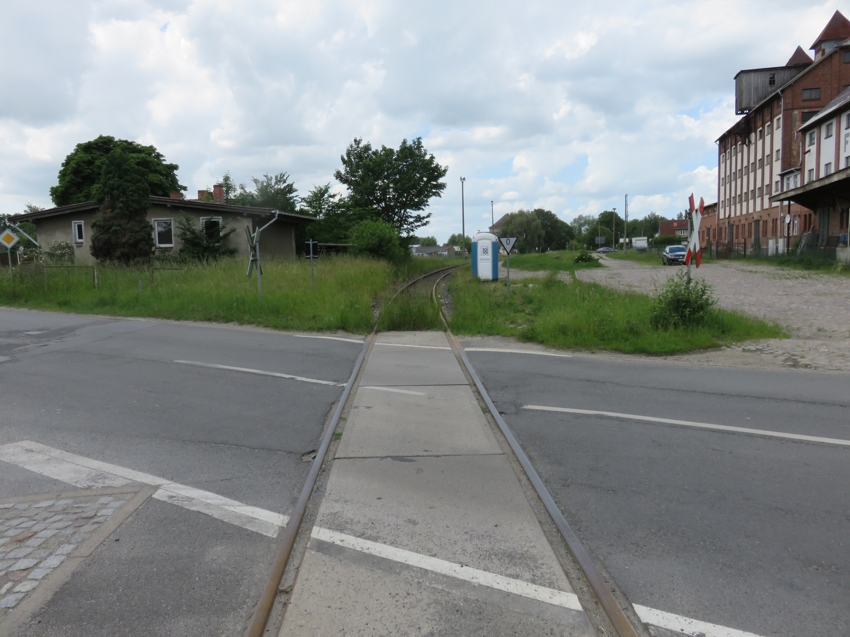 | Blick vom BÜ am Stationsgebäude aus Richtug Greifswald auf den ehemaligen