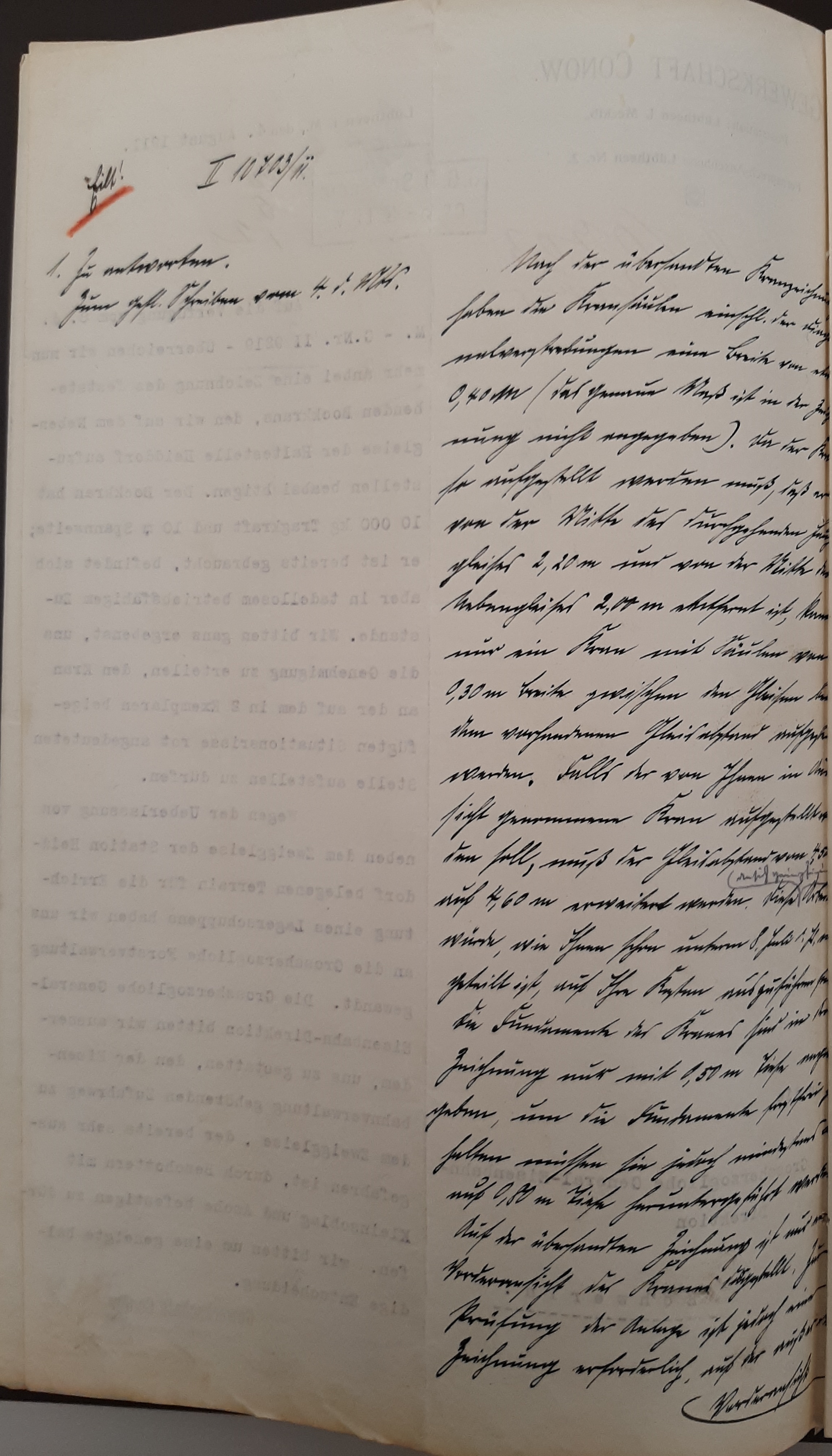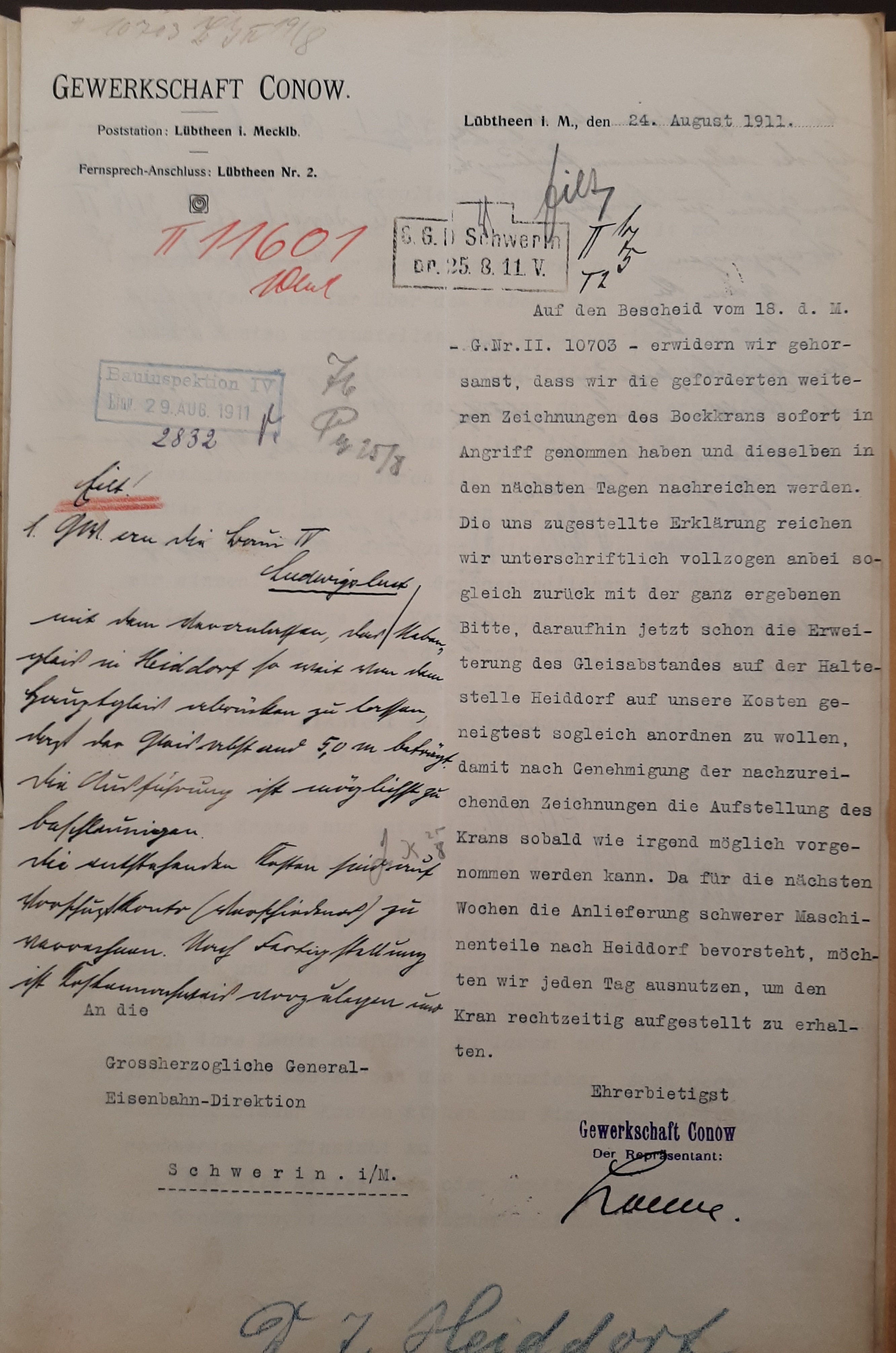 Nutzung der Haltestelle Heiddorf bis zur Fertigstellung des Gleises von Malliß nach Conow Der Bahnhof Malliß ist wegen der schlechten und sehr steilen Weganbindung ungeeignet, um die angelieferten Güter für den Bau des Kali-Bergwerkes abzutransportieren. Das in Heiddorf bereits vorhandene Nebengleis scheint der Gewerkschaft jedoch nicht lang genug zu sein, um mindestens 6 Wagen aufstellen zu können und bittet um eventuelle Verlängerung des Gleises sowie eine beidseitige Anbindung. Außerdem ist beabsichtigt, einen Bockkran für die Entladung aufzustellen, der möglichst fahrbar sein soll. Einen entsprechenden Antrag wird man in Kürze stellen. Da die angelieferten Güter nicht immer am selben Tage abtransportiert werden können, bittet die Gesellschaft um einen Lagerplatz am Gleis, auf dem für wertvolle Güter auch ein Holzschuppen errichtet werden soll. Die Eisenbahndirektion vermerkt dazu, dass das Nebengleis eine Nutzlänge von 178 m hat und somit mindestens 17 Wagen stehen können. Da der Gleisabstand zwischen dem Strecken- und dem Nebengleis nur 4,50 m beträgt, kann kein fahrbarer Bockkran aufgestellt werden, jedoch ein fester Kran. Ein fahrbarer Kran würde keine Vorteile bringen, weil das Verschieben der Wagen genauso schnell geht. Die Gewerkschaft möge den Kran in zweifacher Ausfertigung beantragen. Nach Prüfung des Antrags und der Zeichnung wird man der Gewerkschaft die Bedigungen für Aufstellung mitteilen. Da der Bahn jedoch kein Grundstück am Nebengleis zur Verfügung steht, sollte sich die Gewerkschaft an die Forstbehörde wenden, was sie auch tat.   Einen Monat später erhoelt die Eisenbahndirektion die Zeichnung für den Bockkran und bat zusätzlich darum, den vorhandenen, ausgefahrenen Zufahrtsweg zum Nebengleis befestigen zu dürfen. Für die laut eingereichter Zeichnung geplante Aufstellung des Bockkrans müsste das Nebengleis um mindestens 10 cm auf Kosten der Gewerkschaft verschoben werden. Die Gewerkschaft erklärte sich einverstanden und wollte die Kosten dafür übernehmen. Im August drängte die Gewerkschaft auf eine schnelle Genehmigung des Krans, da große Maschinen im Empfang zu erwarten waren. Ende des gleichen Monats schrieb die Gewerkschaft an die Direktion, dass inzwischen mehrere Wagenladungen ankamen, der Platz zum Abladen der Güter jedoch nur auf rund 1/3 der Gleislänge vorhanden ist. Der Rest ist nicht planiert und macht eine Entladung dort unmöglich. Man bat nun darum, die restliche Fläche neben dem Gleis zu planieren, um ihn für Fuhrwerke zugänglich zu machen und verwies noch einmal auf die zu erwartenden schweren Güter. Die Gewerkschaft musste außerdem weitere Zeichnungen für die Aufstellung des Krans nachreichen. Gleichzeitig bat man, die Verbreiterung des Gleisabstandes sogleich anzuordnen. Der Bauinspektion IV in Ludwigslust wurde mitgeteilt, das Gleis um 50 cm zu verschieben und die Ausführung möglichst zu beschleunigen. Zusätzlich bat die Gewerkschaft, nachdem die Zeichnungen bereits eingereicht wurden, mit der Aufstellung des Kranes möglichst bald beginnen zu dürfen. Schließlich erklärte man sich noch im gleichen Monat mit der Aufstellung einverstanden. Dazugehörender Schriftverkehr: |