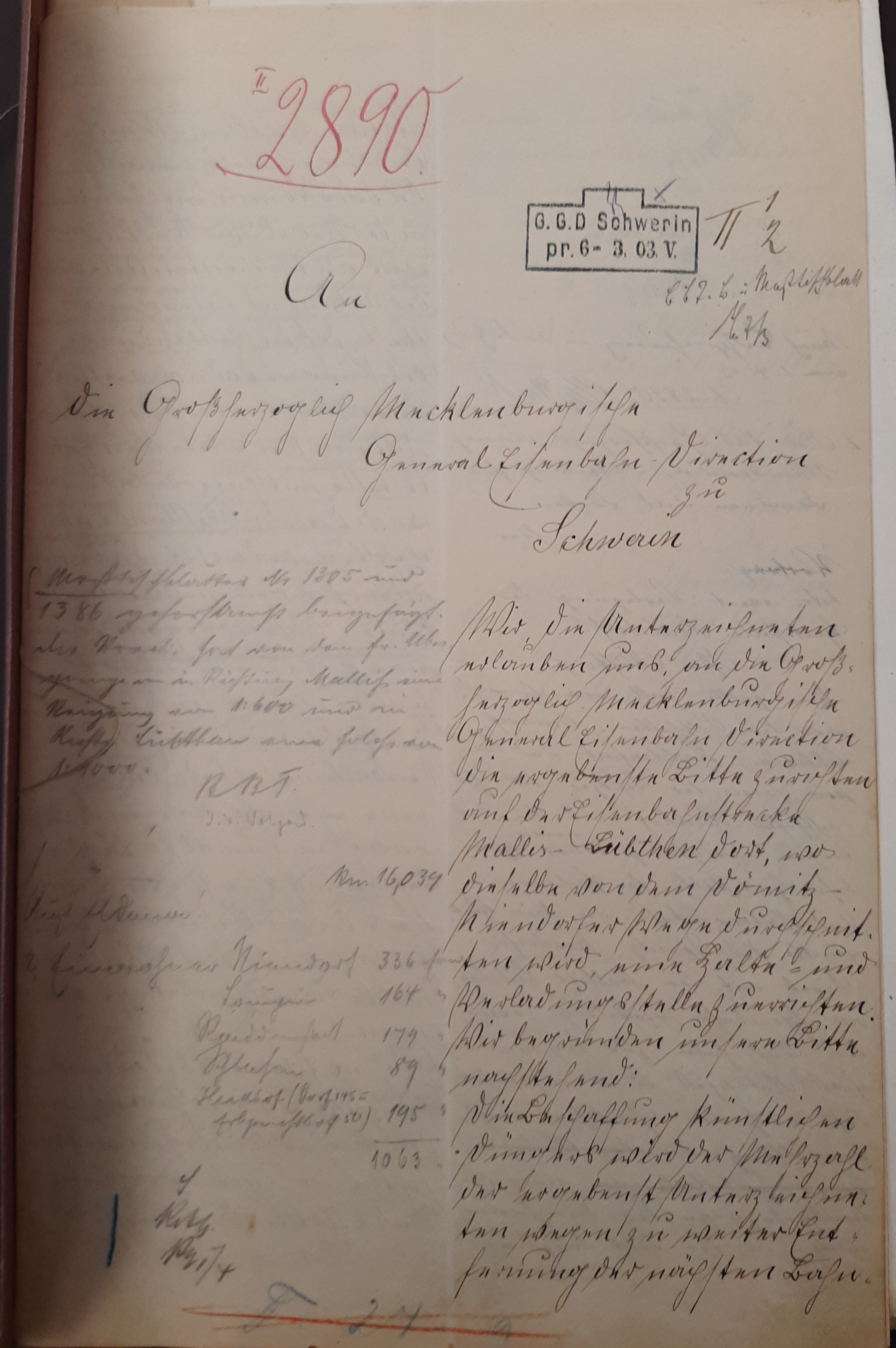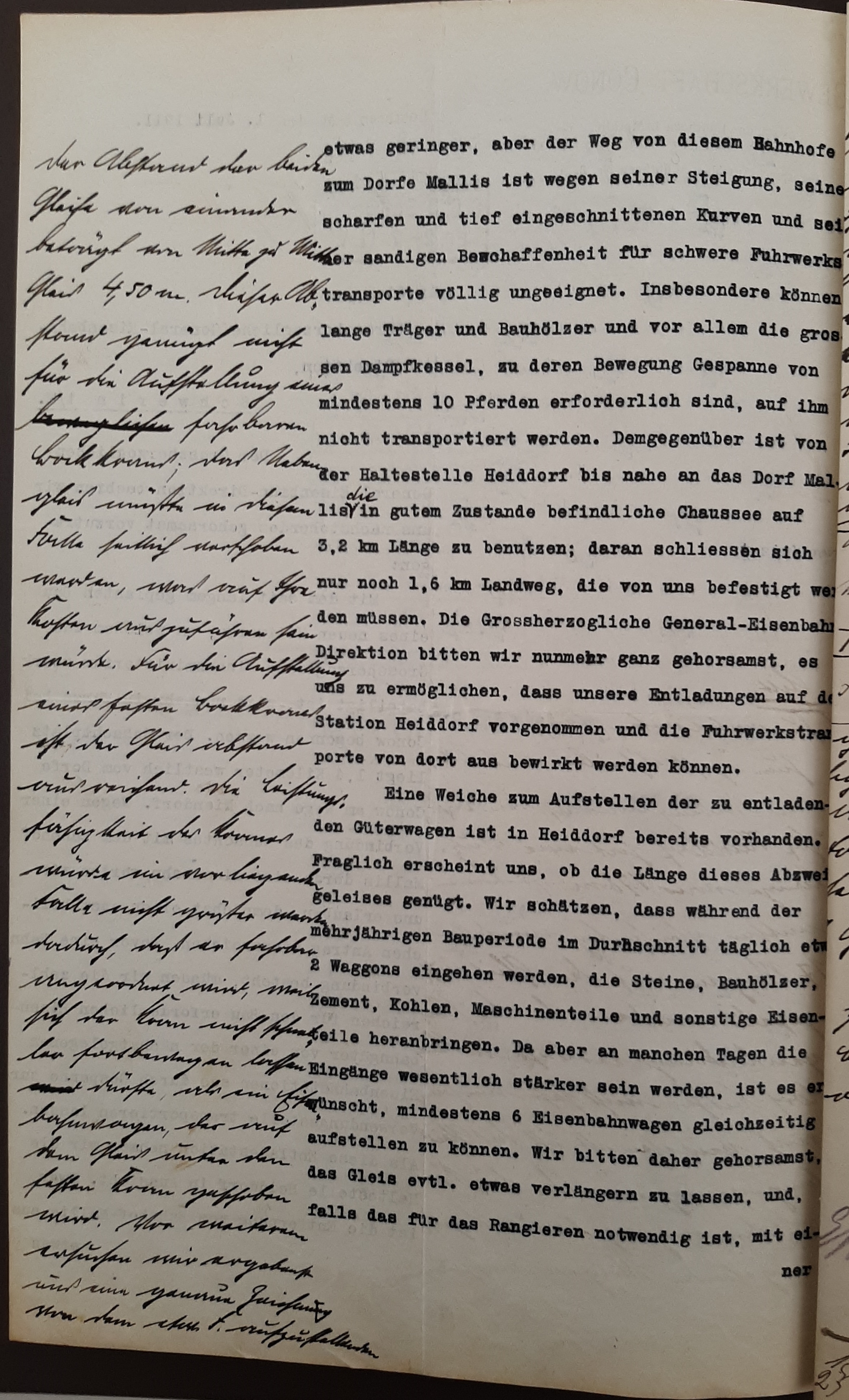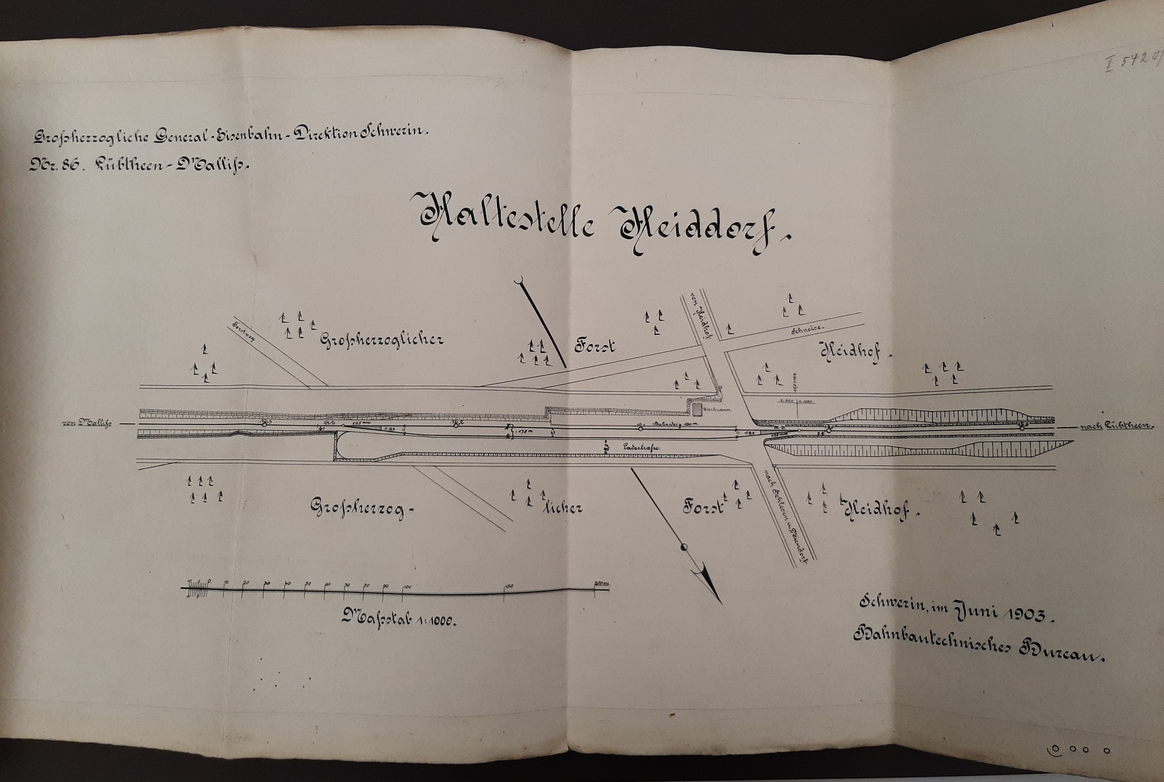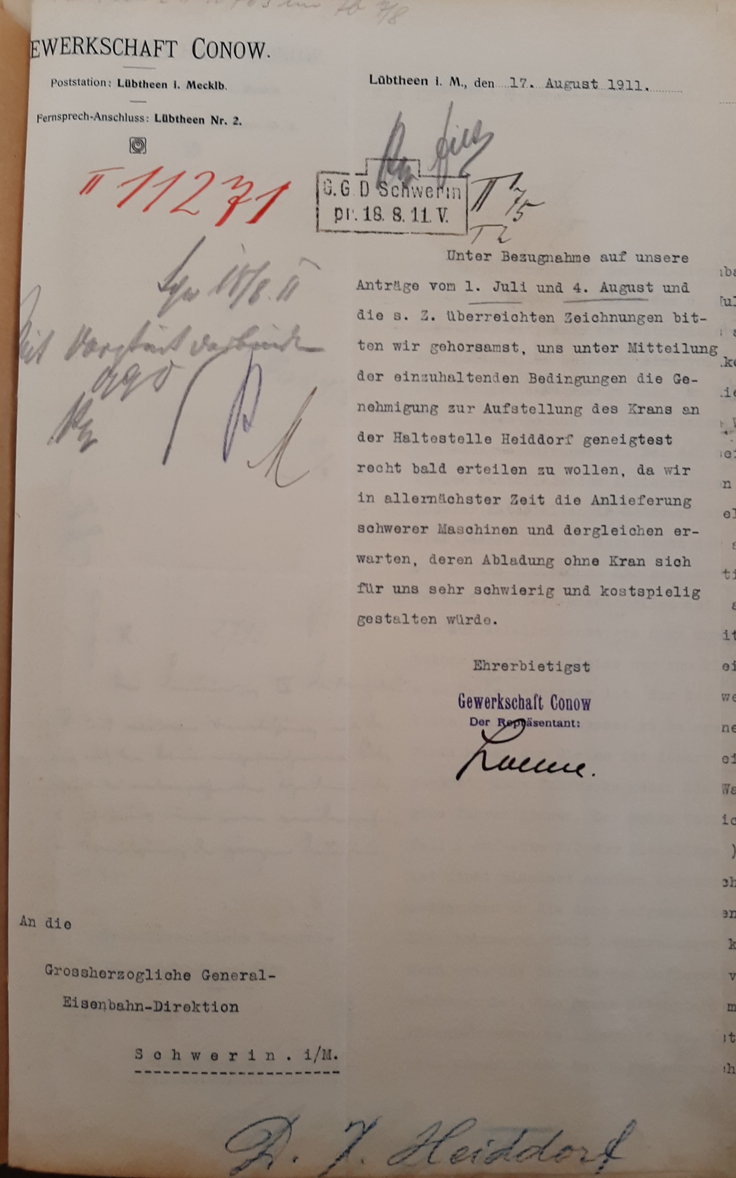 | Inhalt des obigen Schreibens: (Schreiben Nr.) 2415 mit 2 Zeichnungen   1. An die Großherzogliche Chaussee-Inspection zu Grabow   Sofort   Die unterzeichnete General-Eisenbahn-Direktion beabsichtigt den bisher nur dem Personenverkehr bestimmten, an der Kreuzungsstelle der Malliß - Lübtheener Eisenbahn und der Ludwigslust - Dömitzer Chaussee belegenen Haltepunkt Heiddorf auch für den Frachtenverkehr einzurichten. Zu diesem Zweck soll einer Verladestraße längs der bereits für Bauzwecke hergestellten zweiten Geleises angelegt werden und diese durch eine Überfahrt über den östlichen Chausseegraben von der Chaussee aus zugänglich gemacht werden. Die Großherzogl. Chaussee-Inspection Grabow ersuchen wir daher ergebenst, die Herstellung einer Überfahrt über den Chausseegraben in einer Breite von 6 mtr zu gestatten und sich mit der Befestigung des Chausseebanketts im Anschluß an die Steinbahn der Chaussee einverstanden zu erklären. Wir fügen hier einen Lageplan bei, ...[?]welchem die beabsichtigte Anlage ersichtlich gemacht ist und bemerken ferner, daß im Anschluß an den bestehenden Bahndurchlaß ein 30 cm im Durchmesser ...[?]... Thonrohr unter der neuen Überfahrt verlegt werden soll. Die Großherzogl Chaussee-Inspection ersuchen wir ergebenst, die zur Ausführung dieser Anlage erforderliche Zustimmung thunlichst umgehend zu ertheilen und die Bedingungen festzustellen zu wollen.   Schwerin, 5. Juli 1890 Gr. G. Direction [Namenszeichen] |