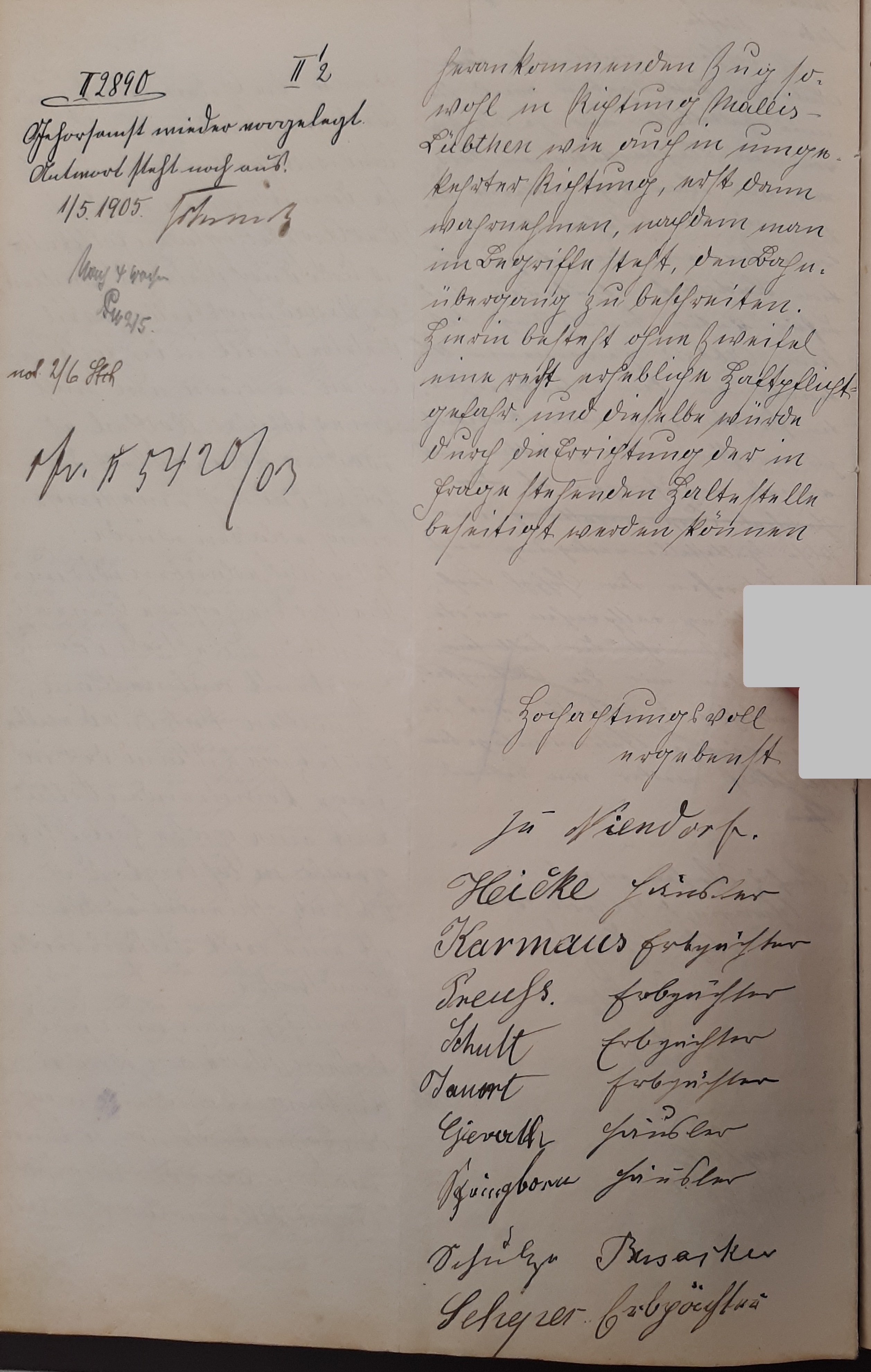 | Inhalt des obigen Schreibens: (Schreiben Nr.) II 2890   An die Großherzoglich Mecklenburgische General Eisenbahn Direction zu Schwerin   Wir, die Unterzeichneten erlauben uns, an die Großherzoglich Mecklenburgische General Eisenbahn Direction die ergebenste Bitte zu richten auf der Eisenbahnstrecke Mallis - Lübtheen dort, wo dieselbe von dem Dömitz Niendorfer Wege durchschnitten wird, eine Halte- und Verladungsstelle zu errichten. Wir begründen unsere Bitte nachstehend: Die Beschaffung künstlichen Düngers wird der Mehrzahl der Unterzeichneten wegen zu weiter Entfernung zur nächsten Bahnstation von ihrem Wohnorte derart erschwert, zumal da den Büdnern uns Händlern in der Regel nur Kuhfuhrwerk als Transportmittel von der Station zur Verfügung steht, daß die Verwendung des Düngers dadurch vielfach unterbleibt, aber durch Errichtung der erbetenen Haltestelle mit Güterverladung würde diesem Übelstand abgeholfen werden. Es würde nicht allein den gesammten Landleuten unserer Gegend damit eine große Erleichterung geschaffen werden, sondern auch der Großherzoglichen Eisenbahn-Verwaltung würde dadurch eine erhebliche Mehreinnahme erwachsen, zumal der für die Beschaffung künstlichen Düngers die an dieser Bahnstrecke belegenen Meckl. Kali-Salzwerke Jessenitz in Betracht kommen. Auch in Folge der bedeutenden Viehzucht in unserer Gegend werden Viehverladungen voraussichtlich in umfangreichem Maße stattfinden. Ebenso würde die Gelegenheit zur Versendung aller weiteren landwirtschaftlichen Erzeugnisse damit geboten werden. Der Großherzoglichen Forstkasse würde durch diese zu erachtende Verladungsstelle, weil diese direct in der Forst belegen insofern ein nicht unerheblicher Vorteil erwachsen als der Wert des Holzes dadurch eine Steigerung erfahren würde. Schließlich erlauben wir uns die Großherzogliche General Eisenbahn Direction darauf aufmerksam zu machen, daß für dieselbe der jetzige Zustand der in Frage kommenden Örtlichkeit eine große Haftpflichtgefahr in sich birgt. Der Dömitz -Niendorfer Weg ist eine recht verkehrsreiche Landstraße. Überfährt man nun auf diesem Wege von welcher Richtung es auch sein mag den Bahnübergang, so kann man in Folge der ungünstigen örtlichen Lage einen herankommenden Zug sowohl in Richtung Mallis - Lübtheen als auch in umgekehrter Richtung, erst dann wahrnehmen, nachdem man im Begriffe steht, den Bahnübergang zu beschreiten. Hierin besteht ohne Zweifel eine recht erhebliche Haftpflichtgefahr und dieselbe würde durch die Errichtung der in Frage kommenden Haltestelle beseitigt werden können.   Hochachtungsvoll ergebenst zu Niendorf. [Unterschriften] |