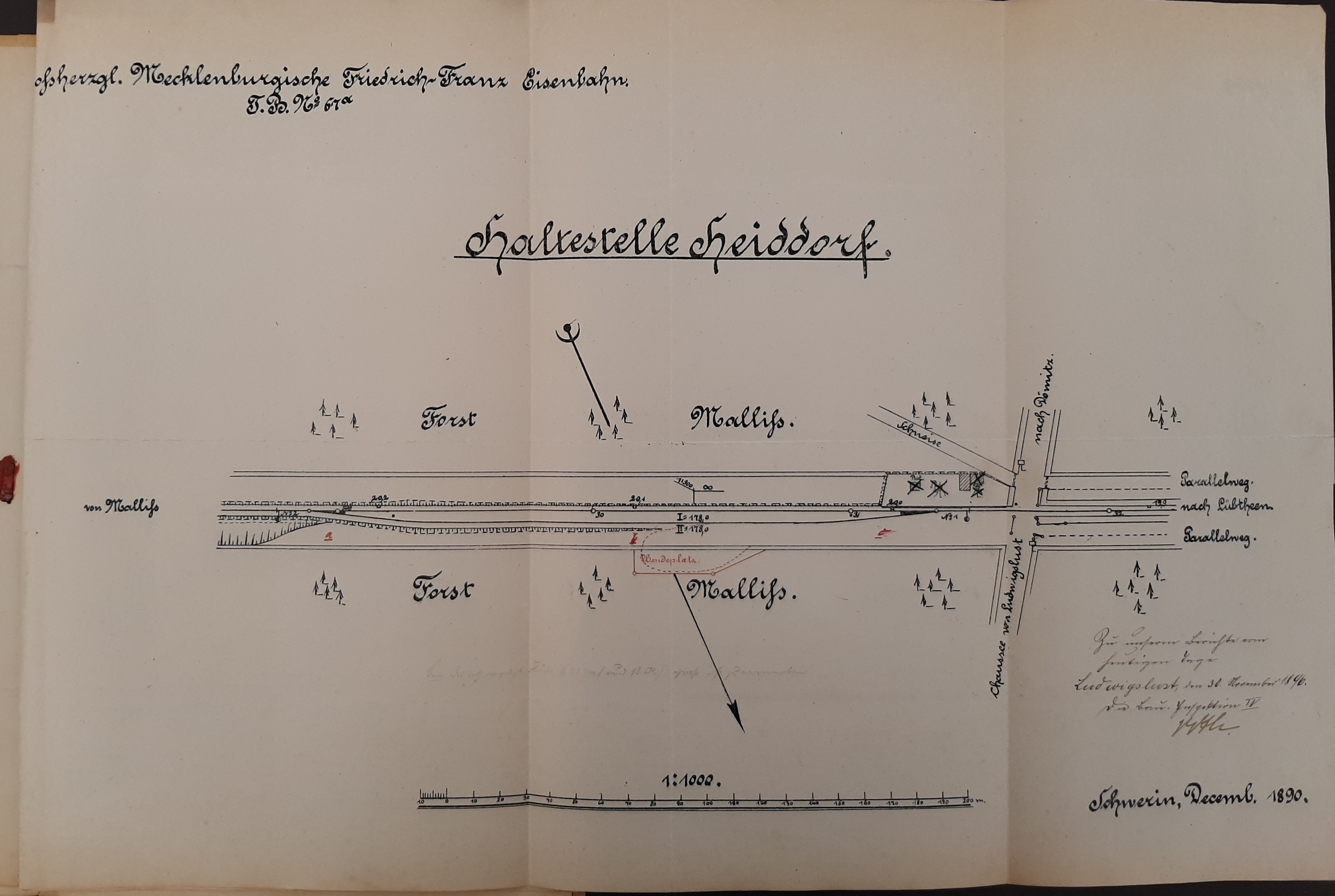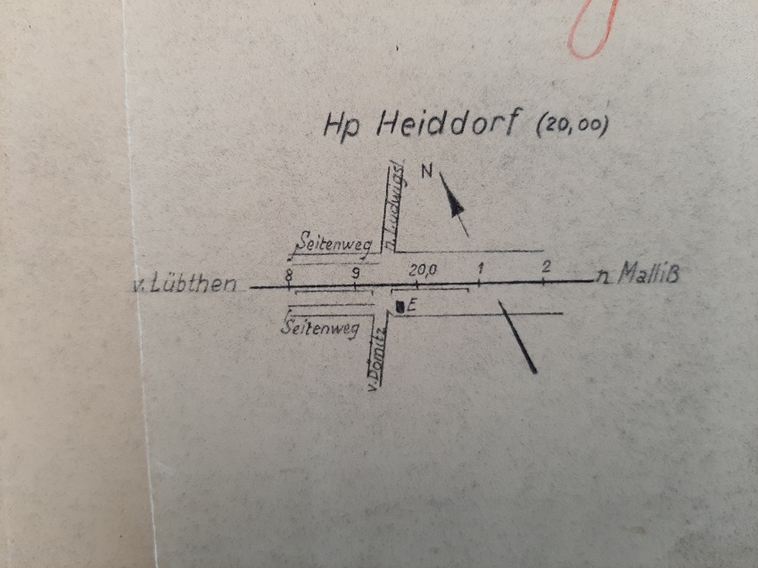 am nördlichen Ortseingang, wo die ehemalige Strecke die Straße querte.   Im Juli 1890 beabsichtigte die General-Eisenbahn-Direction in Schwerin, den Haltpunkt auch für den Güterverkehr nutzbar zu machen. Das Ladegleis bestand bereits für Bauzwecke. Nun sollte daneben eine Ladestraße angelegt werden (weiter siehe 2024).   1903 wurde ein Antrag gestellt, die Station Heiddorf an den Dömitz-Niendorfer Weg zu verlegen (weiter siehe 2024).   Im Juli 1911 kündigt die Gewerkschaft Conow, die das Kalisalz-Bergwerk bauen und betreiben, an, dass sie in Kürze einen Antrag auf den Bau einer Eisenbahn von Malliß nach Conow stellen wird. Bis zur Fertigstellung der Strecke müssen die zum Bau des Werkes erforderlichen Güter mit der Bahn bis zur Haltestelle Heiddorf und von dort aus mit Perdefuhrwerken zur Schachtanlage transportiert werden (weiter siehe 2024). |