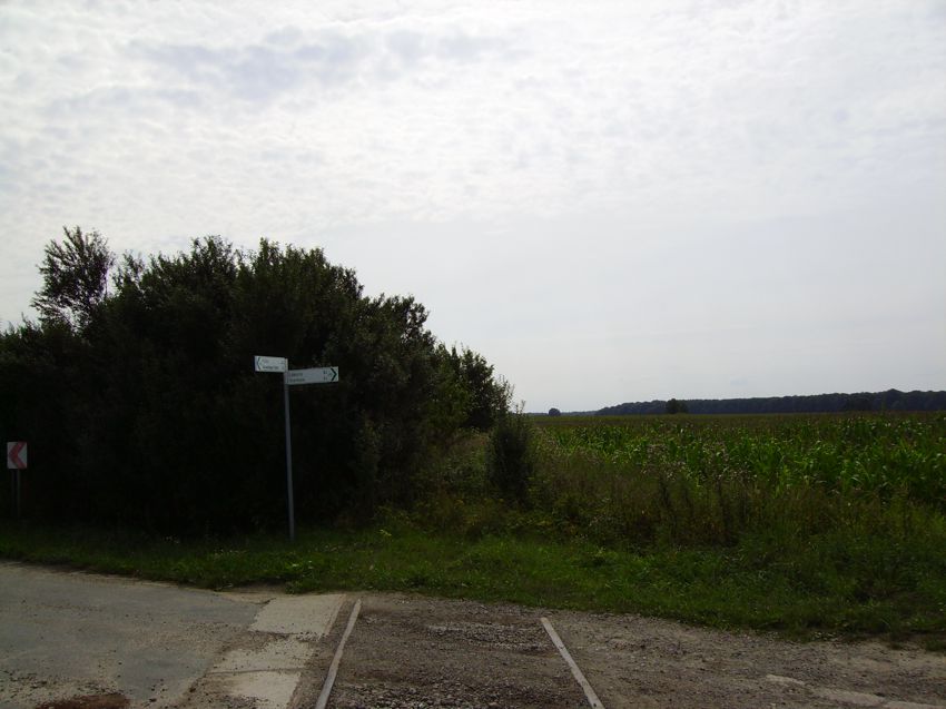 | Hinter den Büschen am BÜ ist der Bahndamm Richtung Tribsees deutlich erkennbar. |
