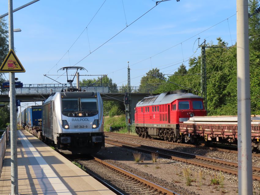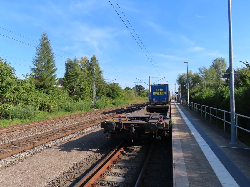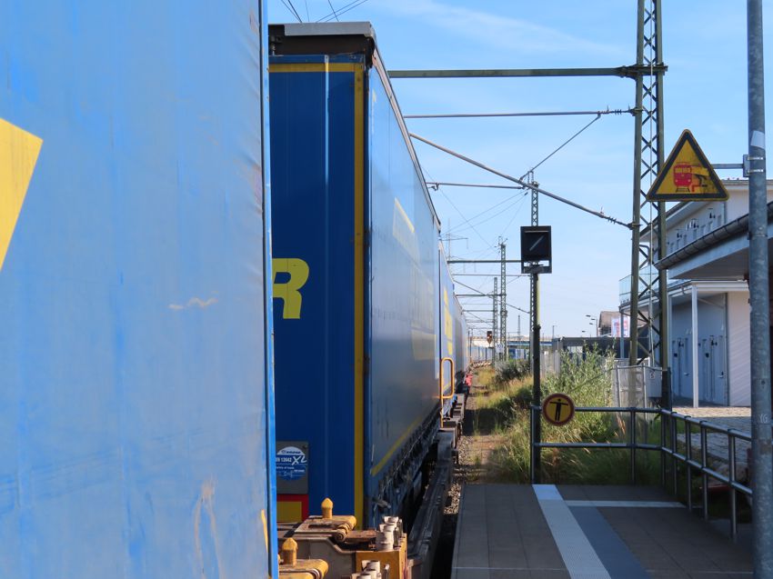 | Auf Gleis 4 fährt ein Zug der rollenden Landstraße vom Seehafen ein. Auf Gleis 1 wartet