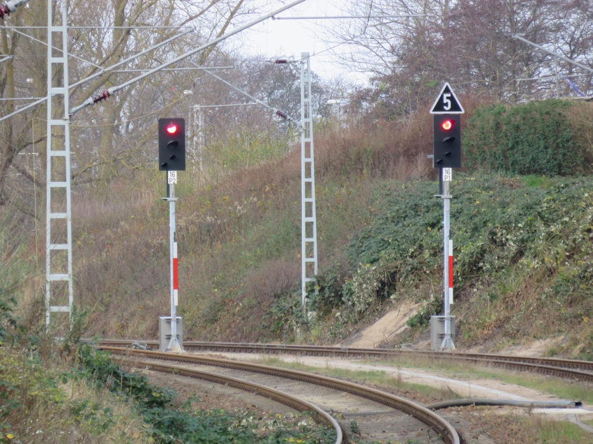 Blick auf die Ausfahrt nach Sassnitz mit den Ausfahrsignalen D und E, den
