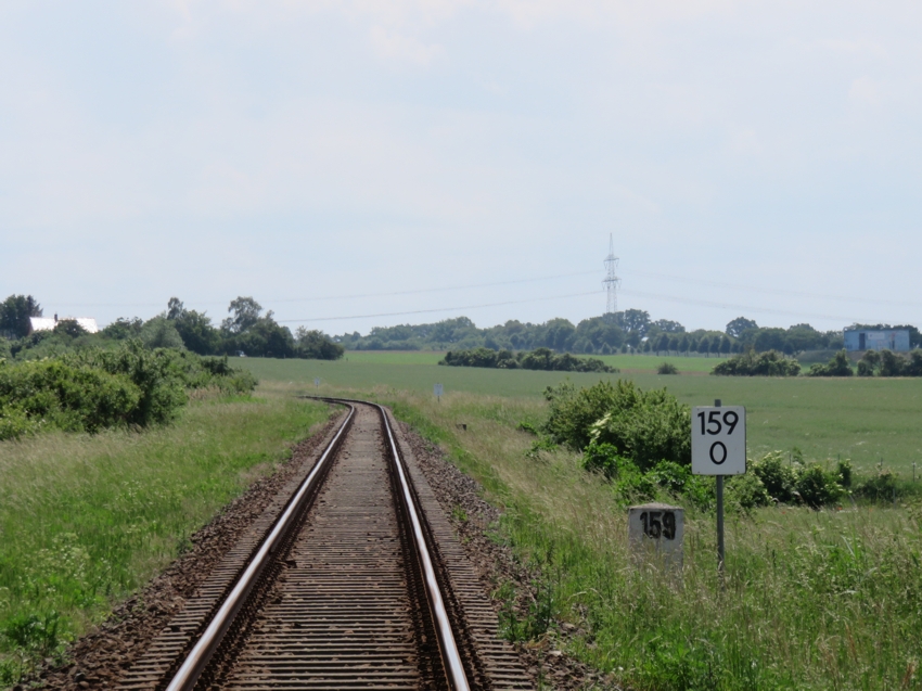 | Zum genauen Standort der ehemaligen Blockstelle habe ich unterschiedliche Angaben gefunden: In einem Atlas der DR von 1976 ist der km 158,95 genannt (direkt am BÜ), in einem Ersatzfahrplan von 1995 wird der 159,4 genannt, ungefähr dort vo das Gleis im Gleisbogen quasi im Gras verschwindet. |