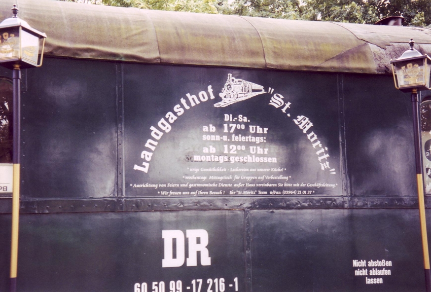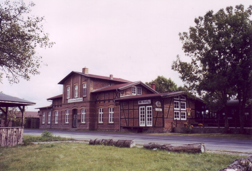 Woldegk. Der ehemalige Bahnhof liegt etwas außerhalb des Ortes und beherbergt heute einen Landgasthoft. Die Besitzer beweisen Sinn für die Tradition ihres Grundstückes. Hier kann man mechanische Schranken und ein Formhauptsignal sowie eine Kleinlok der DR (BR 100) und einen ehemalige Personenwagen ansehen. Natürlich auch ungezählte kleinere Dinge der Bahn. Das Hotel präsentiert sich auch im Internet unter Landgasthof St. Moritz . |