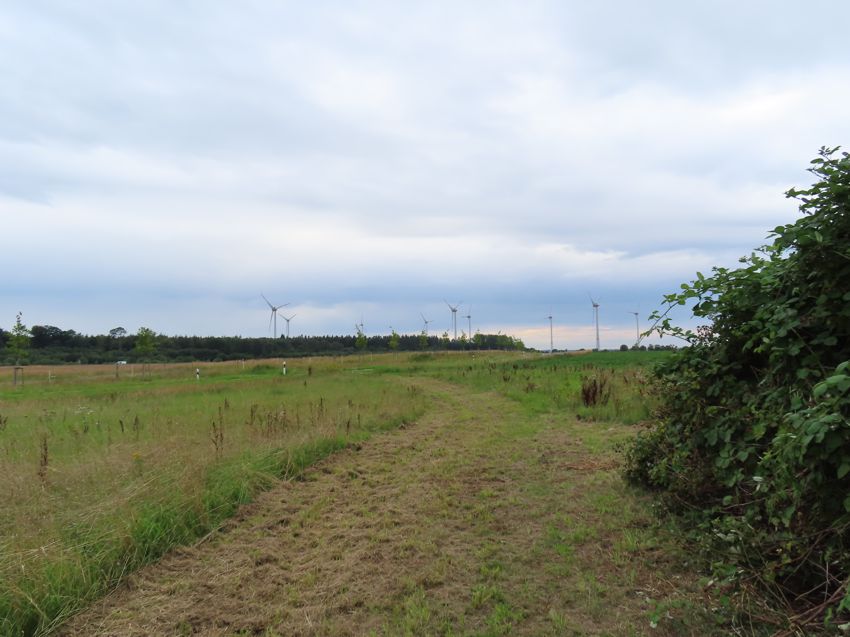 | Die ehemalige Bahntrasse hinter dem Dorf ist heute ein Radweg. Blick in Richtung Rekentin |