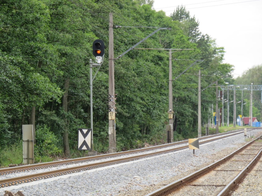 | Blick auf die Strecke von Szczecin (linkes Gleis) mit dem Einfahrvorsignal des
