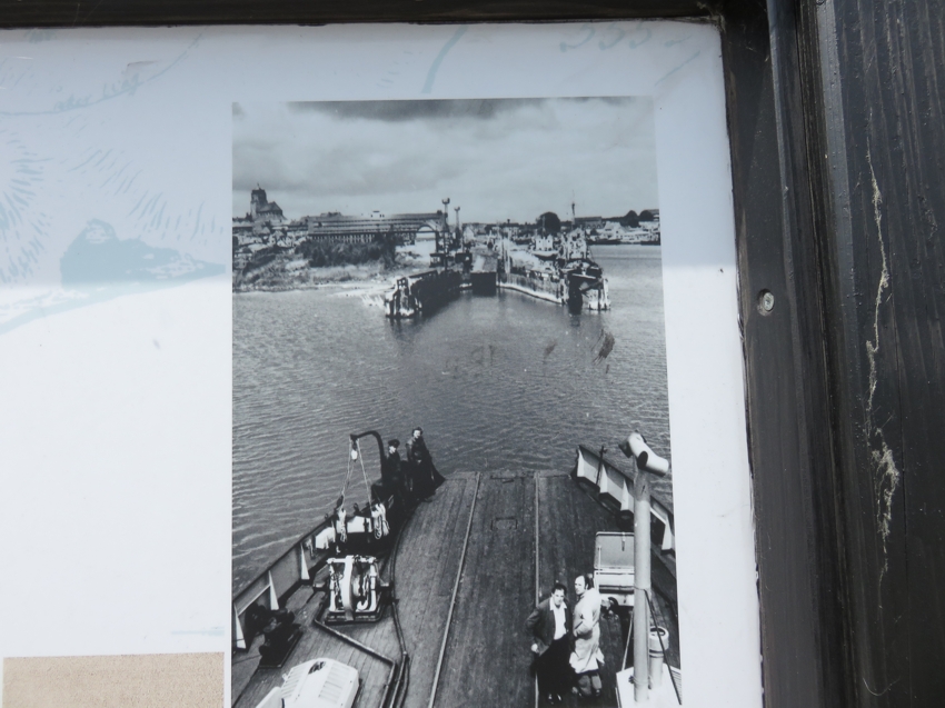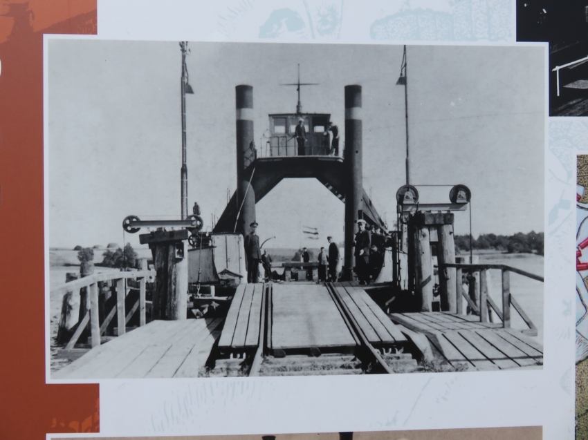 | Bilder von einer Informationstafel zur ehemaligen Eisenbahnfähre. Das Fährschiff gibt es noch. |