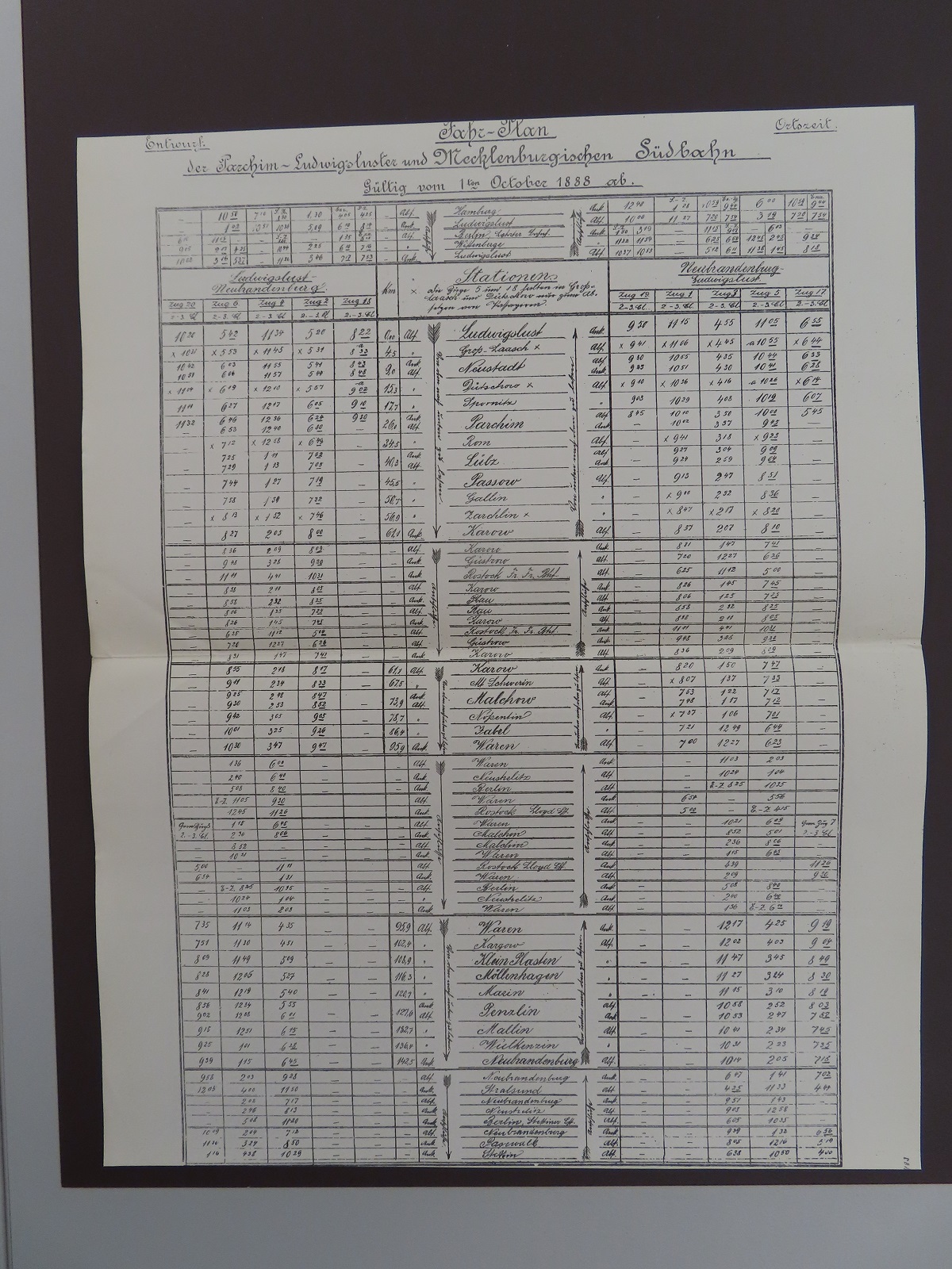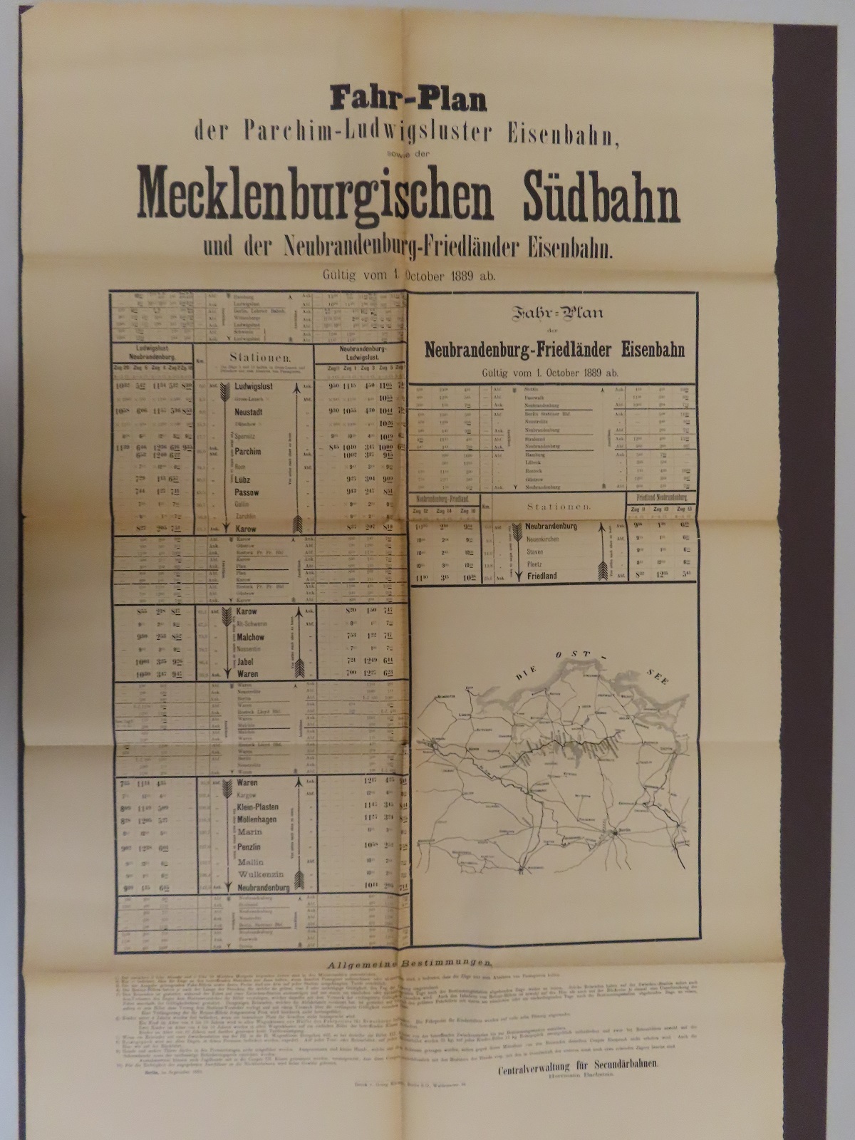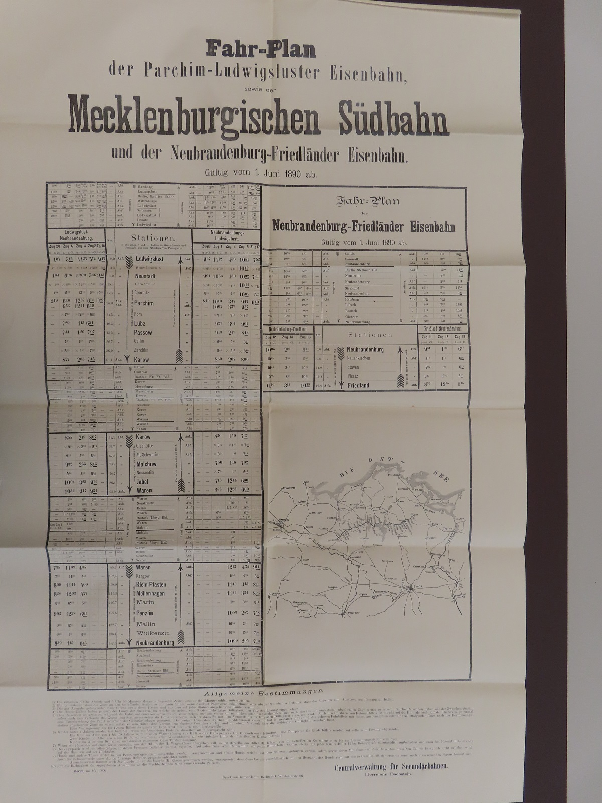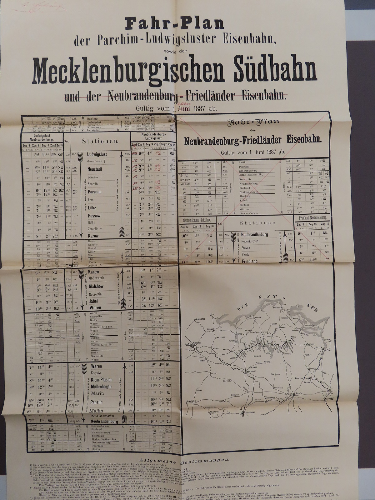 Bereits am 15. Juni 1880 wurde die Parchim-Ludwigsluster Eisenbahn eröffnet. Die fast 117 km lange Mecklenburgische Südbahn wurde am 28. Januar 1885 als normalspurige Sekundärbahn eröffnet, nachdem sich 1883 die Aktiengesellschaft aus den Städten Parchim, Lübz, Waren, Penzlin und Neubrandenburg sowie die Local- Eisenbahnbetriebsgesellschaft Hamburg und die Norddeutsche Bank Hamburg konstatierte. Der Bahnbau begann noch im gleichen Jahr. Somit entstand eine Verlängerung der Parchim-Ludwisgluster Eisenbahn in den östlichen Teil von Mecklenburg- Schwerin bis nach Mecklenburg-Strelitz, um dort an die Mecklenburgische Friedrich-Franz-Eisenbahn anzuschließen. Bis 1888 blieb die Bahn verschuldet, weil sich der Durchgangsverkehr von der PLE und die Übergänge in Karow, waren und Neubrandenburg nicht im erwarteten Umfang entwickelten. 1890 wurde die Bahn verstaatlicht. Ab 1885 wurden die Fahrpläne der drei Bahngesellschaften gemeinsam veröffentlicht.   Die Bildfahrpläne werden auf dieser Seite nicht direkt gezeigt. Zum Ansehen bitte auf die entsprechenden links klicken! |