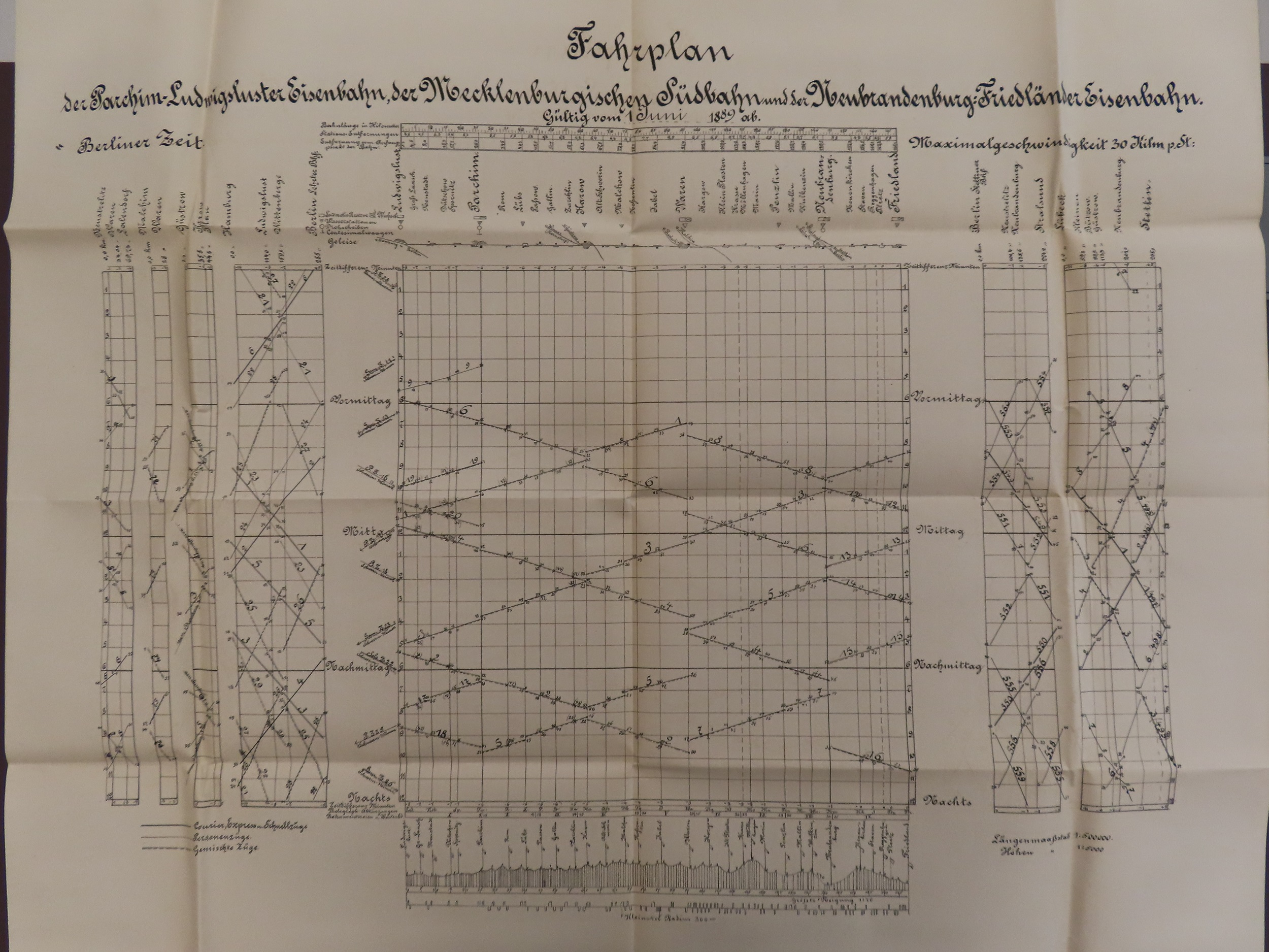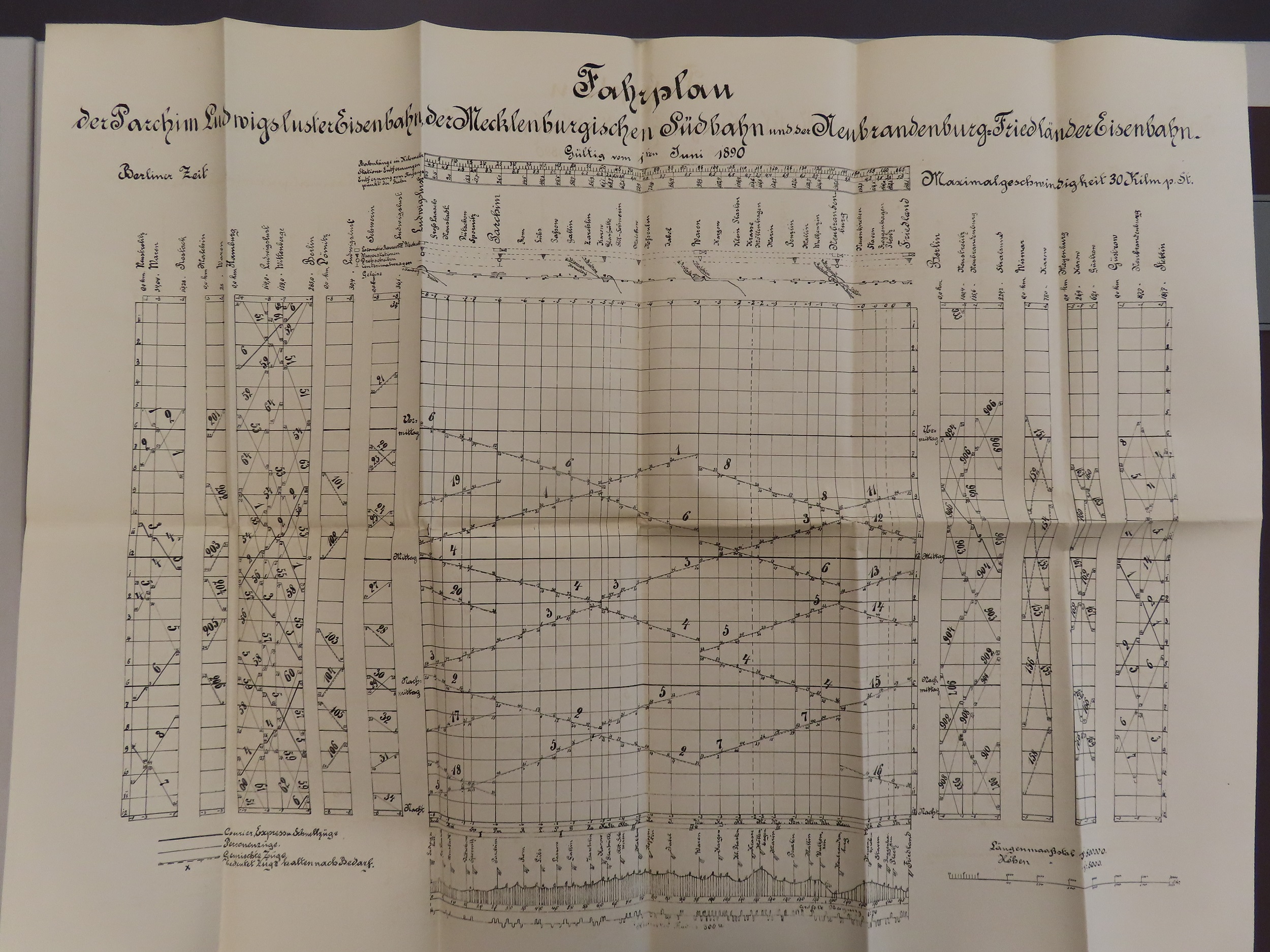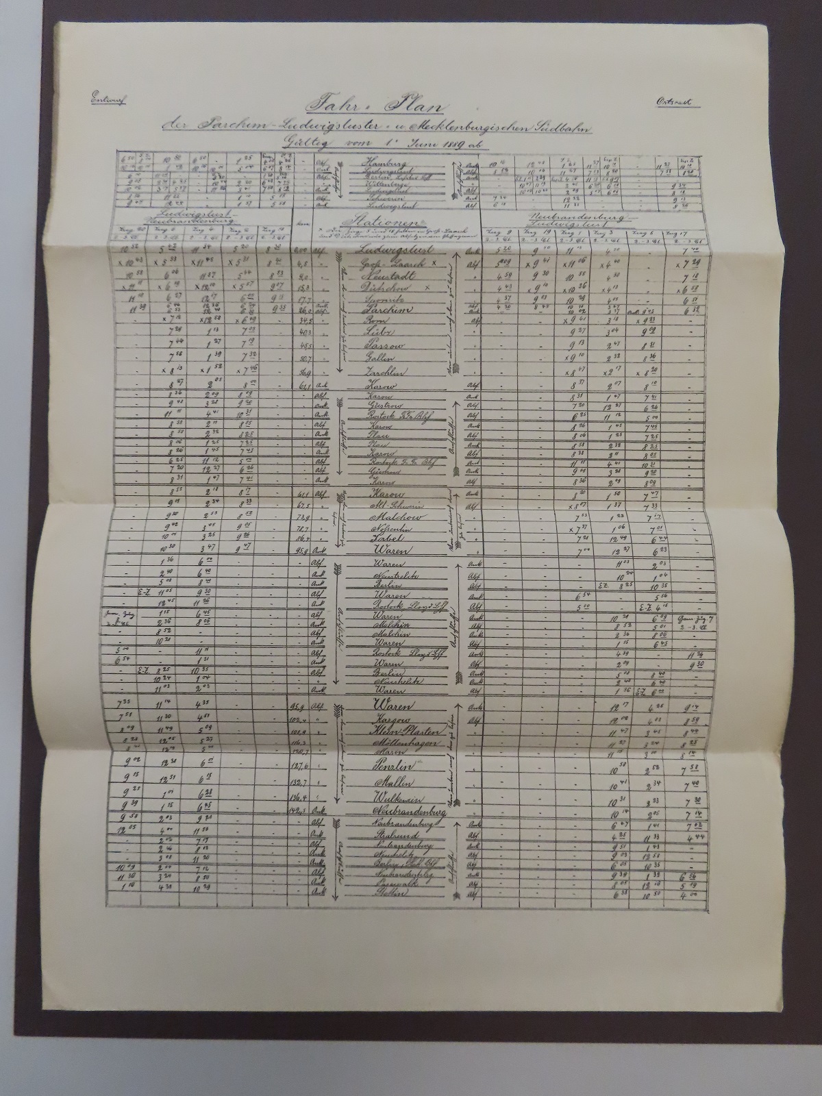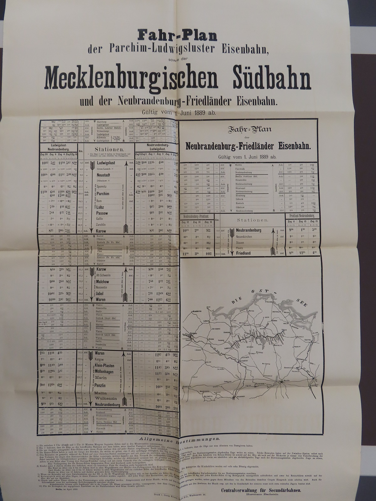 Bereits am 15. Juni 1880 wurde die Parchim-Ludwigsluster Eisenbahn eröffnet. Die fast 117 km lange Mecklenburgische Südbahn wurde am 28. Januar 1885 als normalspurige Sekundärbahn eröffnet, nachdem sich 1883 die Aktiengesellschaft aus den Städten Parchim, Lübz, Waren, Penzlin und Neubrandenburg sowie die Local- Eisenbahnbetriebsgesellschaft Hamburg und die Norddeutsche Bank Hamburg konstatierte. Der Bahnbau begann noch im gleichen Jahr. Somit entstand eine Verlängerung der Parchim-Ludwisgluster Eisenbahn in den östlichen Teil von Mecklenburg- Schwerin bis nach Mecklenburg-Strelitz, um dort an die Mecklenburgische Friedrich-Franz-Eisenbahn anzuschließen. Bis 1888 blieb die Bahn verschuldet, weil sich der Durchgangsverkehr von der PLE und die Übergänge in Karow, waren und Neubrandenburg nicht im erwarteten Umfang entwickelten. 1890 wurde die Bahn verstaatlicht. Ab 1885 wurden die Fahrpläne der drei Bahngesellschaften gemeinsam veröffentlicht.   Die Bildfahrpläne werden auf dieser Seite nicht direkt gezeigt. Zum Ansehen bitte auf die entsprechenden links klicken! |