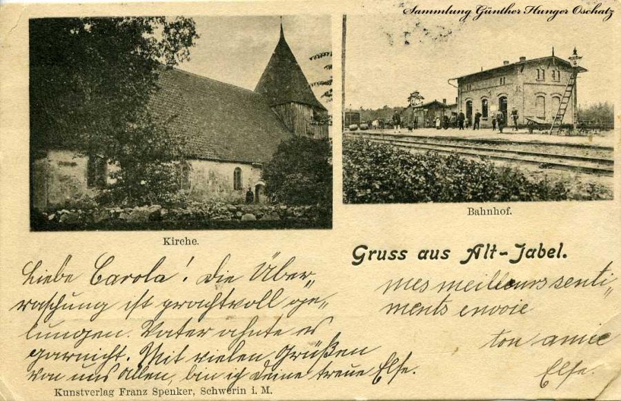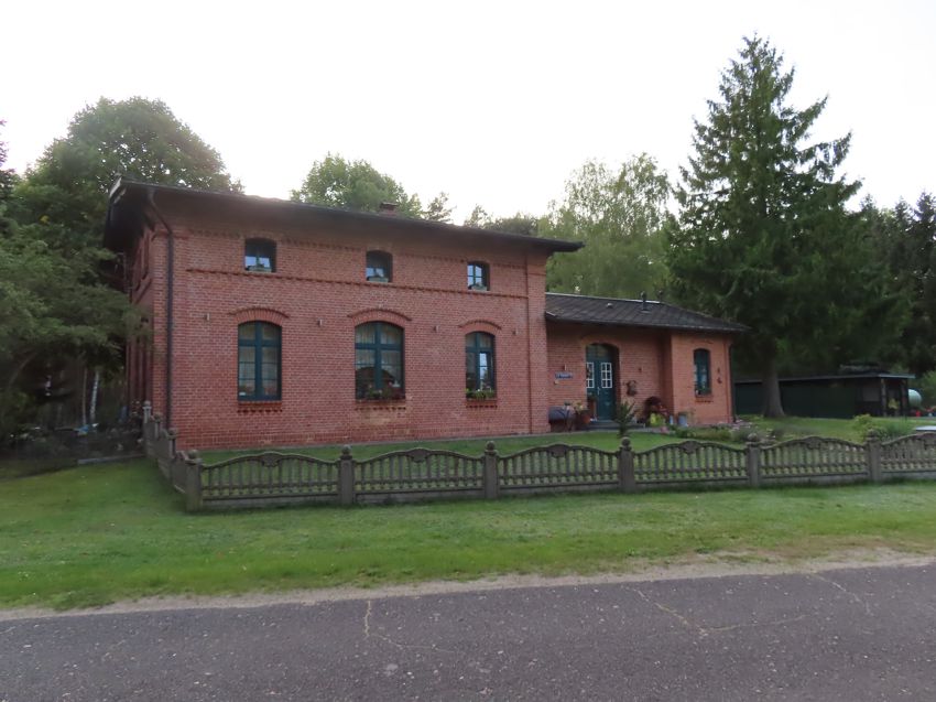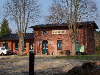 Die ehemalige Station befand sich am Ortseingang. 2002 war ich das erste Mal hier und fand das ehemalige Stationsgebäude am Ortseingang. Das Gebäude war bewohnt und machte einen sehr gepflegten Eindruck. 21 Jahre später war ich erneut auf der Durchreise. Es hatte sich eigentlich nichts verändert.   Ab 1909 zweigte vom südlichen Stationsende eine Anschlussbahn zu einem Kieslager südöstlich des eigentlichen Dorfes Alt Jabel ab. Mit dem Bau wurde der Tiefbauunternehmer Mühlhans aus Schwerin beauftragt. Heute befindet sich dort das Waldbad. Die Trasse ist heute noch als Waldweg vorhanden. |