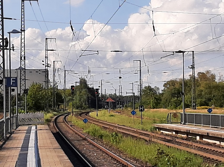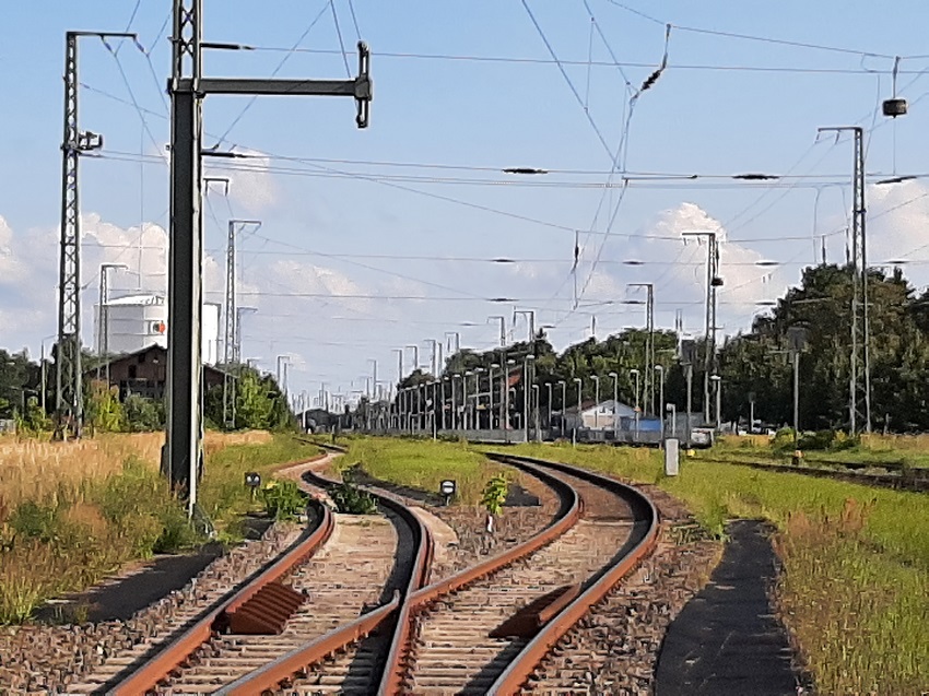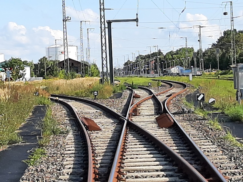 | links ein Anschlussgleis (ehemals VEAB und VEB Hafenumschlagsbetrieb), in der Mitte das Gleis zum Umlaufen der Werklok der Zuckerfabrik, davon zweigte einste das Gleis zum Guterboden ab, rechts das Hauptgleis 3, das auch als Übergabegleis für die Wagen von und zur Zuckerfabrik genutzt wird | ||||||||||||||||||||||||||||||||||||||||||||||||||||||||||||||||||||||||||||||||||||||||||||