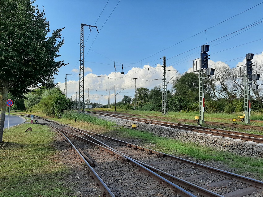 | Blick auf die Ausfahrsignale in Richtung Züssow; links der Beginn der Anschlussbahn zum Peenehafen | ||||||||||||||||||||||||||||||||||||||||||||||||||||||||||||||||||||||||||||||||||||||||||||