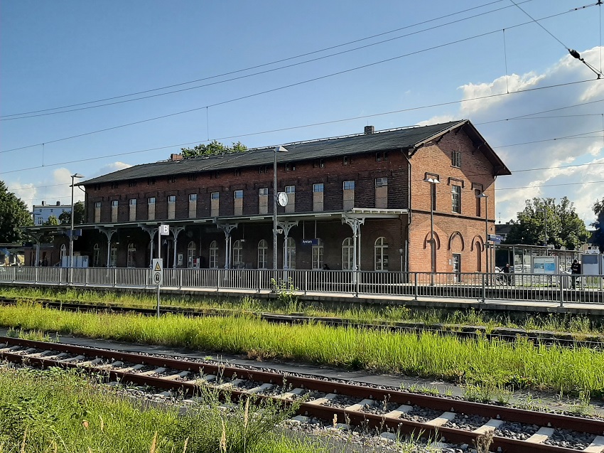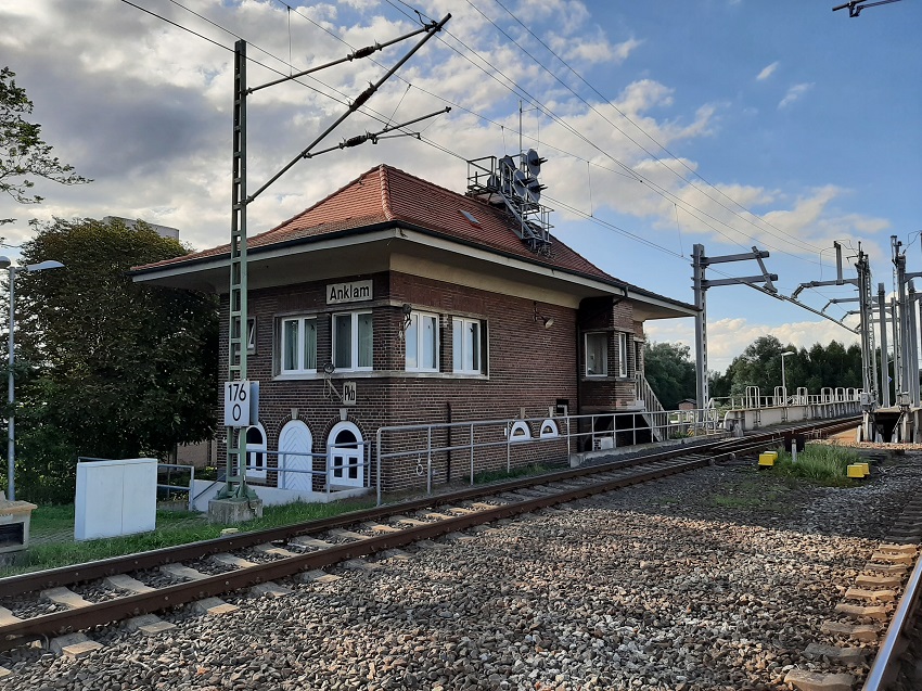 Anklam liegt um Unterlauf der Peene und geographisch ungefähr auf halbem Wege zwischen Stettin und Stralsund. Östlich von Anklam liegt nur wenige Kilometer entfernt die Südwestspitze der Insel Usedom, nur durch den Peenestrom getrennt. 1283 trat die Stadt dem Bund der Hanse bei und darf sich seitdem Hansestadt nennen.   Im Zuge des Bahnbaues der Strecke Angermünde - Stralsund erhielt Anklam den Anschluss an die Eisenbahn. Der Bahnhof wurde angemessen mit Gleisen und Bauten ausgestattet. Das Empfangsgebäude wurde bereits 1861 errichtet. Auch Lok- und Wagenschuppen, die Güterhalle, ein Wasserturm und eine Drehscheibe wurden gebaut. Bei der Planung des Bahnhofs wurde auch gleich der Anschluss zum Hafen mitgeplant. Große Seeschiffe (1876 noch 14) waren in Anklam beheimatet. Jährlich legten über 3.000 Schiffe an oder befuhren die Peene. Zwischen der Silostraße und der Altstadt befand sich ein Stichkanal, an dem Frachter anlegen konnten.   Erst im November 1863 wurde die erste Eisenbahnbrücke über die Peene in Betrieb genommen. Die Brücke wurde nach dem System Schwedler als eingleisige Drehbrücke gebaut.   1883 nahm die Zuckerfabrik ihren Betrieb auf, die direkt mit einem Anschlussgleis mit dem Bahnhof verbunden wurde.   1899 wurde das Empfangsgebäude umgebaut und 1910 verlängert wegen gestiegener Reisendenzahlen und für eine angepasste Bahnhofsrestauration. Für die vielen Fahrgäste mit niedrigem sozialen Status, die in der IV. Wagenklasse reisten und bei den sozial höher gestellten Reisenden nicht gerne im Wartesaal gesehen waren, wurde auf dem Vorplatz ein eigener Wartesaal genaut, die sogenannte "Schnitterhalle". Diese Fahrgäste kamen aus Polen und den damaligen deutschen Ostprovinzen und arbeiteten als Erntehelfer auf den Gütern im Umland. 1909 wurde wegen der oft langen Schrankenschließzeiten des BÜ Bluthsluster Straße, oft bis zu 30 Minuten, eine Fußgängerbrücke in Betrieb genommen.   1907 wurde die erste Eisenbahnbrücke durch eine neue, doppelte Rollklappbrücke der Bauart Scherzer ersetzt. Nun konnte zweigleisig über die Peene gefahren werden. Für die Bedienung wurde die Wärterbude Pdk (Peenebrücke Deckungsstelle) errichtet.   Nach 1930 wurden das Stellwerk Pkb und die Signalanlagen auf dem Bahnhof modernisiert.   Ab 1935 wurde der Flugplatz südwestlich der Stadt erbaut, zu dem ab 1936 vom Bahnhof aus eine Anschlussbahn errichtet wurde. Der Trassenverlauf ist noch heute zu erkennen. Die Trasse führte bis zum Posten 93 in km 174,0 parallel zur Hauptbahn und wurde dann südlich um die Stadt herumgeführt. Im gleichen Jahr kauften die Arado Flugzeugwerke die 1869 entstandene Eisengießerei östlich des Bahnhofs und baute sie zu einer Bau- und Montagefabrik für Militärflugzeuge um und aus. 1937 wurde dafür eine Anschlussbahn in Betrieb genommen.   Im gleichen Jahr wurde die 1907 gebaute Peeneklappbrücke durch eine (genauer gesagt zwei) neue Klappbrücken ersetzt, da der Eisenbahnverkehr stark zugenommen hatte.   Nach 1939 entstand im Rahmen der Kriegsvorbereitung ein unterirdischer Luftschutzbunker in der Nähe des Busbahnhofs. An den Fensterleibungen wichtiger Räume des Empfangsgebäudes wurden Riegel für dicke Stahlplatten, die als Splitterschutz dienen sollten, angebracht. Diese Riegel sind noch heute z.B. an den Fenstern des ehemaligen Aufsicht vorhanden. An mehreren Stellen auf dem Bahngelände wurden Kleinbunker aufgestellt. Die Signale erhielten Blenden, damit die Signalichter von oben nicht gesehen werden konnten. Am 9. Oktober 1943 fand ein Luftangriff auf Anklam statt, der große Schäden in der Stadt und auf dem Bahngelände anrichtete. Auch der östliche Teil der Peeneklappbrücke der Hauptbahn wurde zerstört und erst 1981 ersetzt. Hauptangriffsziel war das Arado-Werk. Mehrere Bomben trafen dabei auch das Gleisfeld und zerstörten die o.g. Fußgängerbrücke und große Teile des Stadtzentrums. Die Lehre an uns alle: Wer Krieg sät, wird Tod und Zerstörung ernten und keinen Sieg. Darüber sollten auch die deutschen Politiker einmal nachden und sich intensiv mit der inzwischen sehr stark aufgeklärten Geschichte besonders des zweiten Weltkrieges befassen! Das ist 2026 aktueller denn je! Am 4. August 1944 erfolgte ein weiterer Luftangriff, bei dem das Arado-Flugzeugwerk und komplett die Zuckerfabrik zerstört wurden, die bis zur Kampagne 1946 wieder betriebsfähig aufgebaut wurde. Im gleichen Jahr wurde das Arado-Werk demontiert. Die Anschlussbahn blieb teilweise bis heute erhalten. Dort siedelten sich zu DDR-Zeiten andere Betriebe an, z.B. Minol in den 1960er Jahren.   1945 wurden die Schienen des Streckengleises I der Hauptbahn Angermünde - Stralsund sowie Schienen, Kleineisen und Weichenteile in Bahnhöfen als Kriegsreparation abgebaut und in die Sowjetunion verbracht. Das betraf auch Lokomotiven. Auf vielen Stationen wurden Stationsschilder in kyrillischer Schrift angebracht. Unmittelbar nach Kriegsende war noch nicht klar, ob weitere Teile Vorpommerns, als die bisher bekannten, Polen zugeschlagen werden. In diesem Fall wäre aus Anklam "Nakielec" geworden. Überall herrschte Mangel bei der Eisenbahn, besonders an Wagen, weil viele noch vorhandene Gleise mit Schad- und Rückführfahrzeugen vollgestellt waren. Täglich mussten Wagen für die Überführung nach Stettin bereitgestellt werden, um dort Heimatvertriebene abzuholen und nach Anklam zu bringen. Auch aus dem Auffanglager in Löcknitz fuhren solche Züge nach Anklam. Nicht immer war das mögich.   Nach 1958 wurden die Bahnsteigsperren in Anklam außer Betrieb genommen, sodass die Bahnsteige nun jederzeit für jedermann frei zugänglich waren.   Anfang der 1960er Jahre wurde die Drehscheibe ausgebaut und durch Weichenverbindungen ersetzt. Der Lokschuppen wurde abgerissen.   1963 wurde der Stichkanal zugeschüttet und man verlängerte auf diesem Terrain die Normal- und Schmalspurgleise. Letztere wurden nach der Stilllegung der MPSB 1970 abgebaut.   1972 wurde das Gr