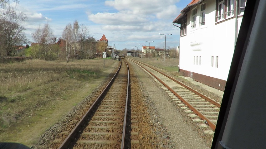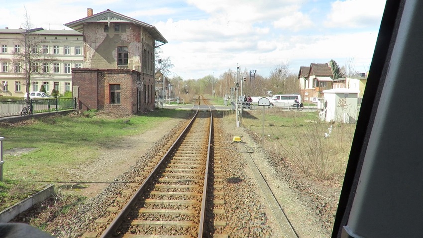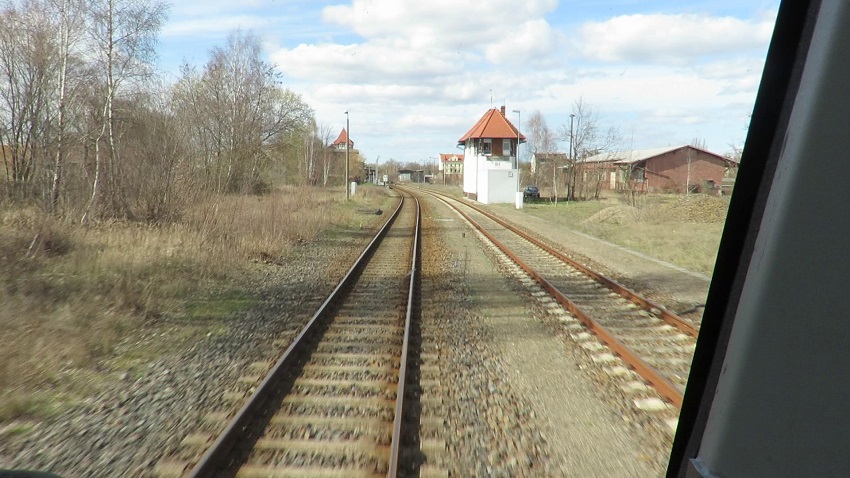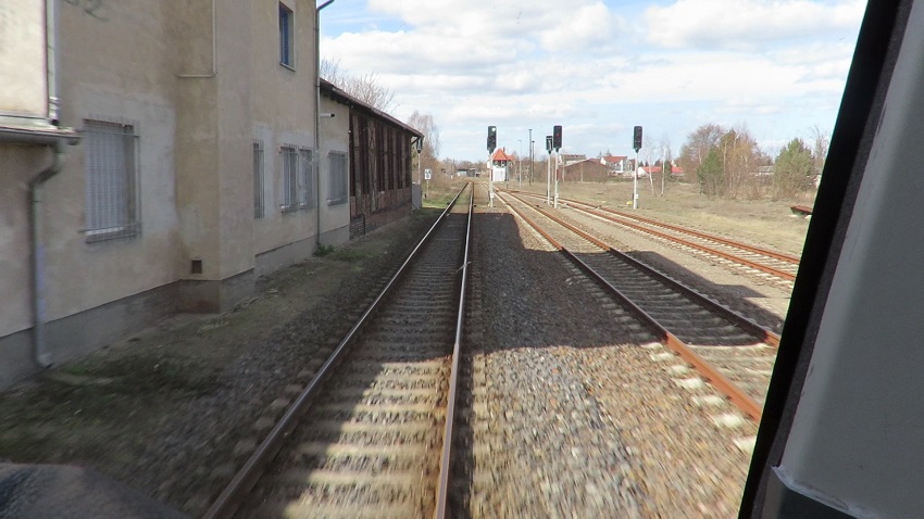 | Vorbei geht es an einem ehemaligen Lokschuppen, hinter dem bereits die heutigen Ausfahrsignale in Richtung Niederfinow stehen. |
