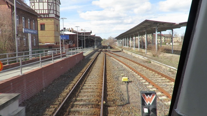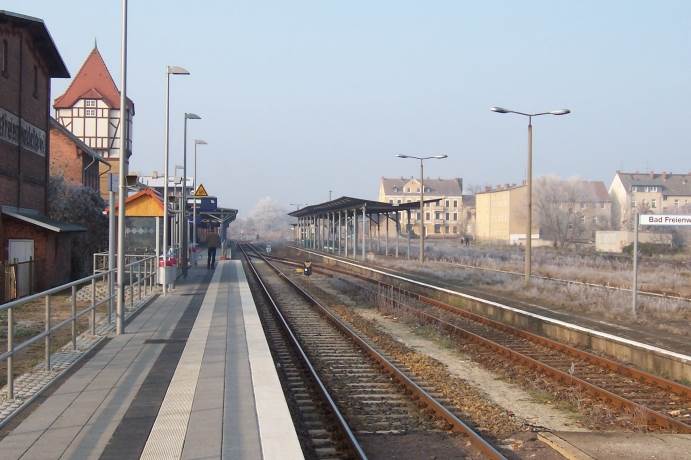 | Bad Freienwalde liegt nordöstlich von Berlin in der Nähe der Oder. Vom Bahnhof zweigten einmal zwei weitere Strecken ab: bis 1967 die Kleinbahn nach Hohenwutzen (- Zehden) und bis 1997 die Nebenbahn nach Angermünde, auf der der Verkehr bereits 1995 abbestellt wurde. Beide Strecken sind demontiert. Ab 1950 wurde der Kleinbahnhof (Gebäude heute noch vorhanden) der Strecke nach Zehden geschlossen und die Kleinbahn in den heutigen Bahnhof geführt. Am Südende des Bahnhofs steht noch ein weiteres ehem. Stellwerk. An der Brücke der Hochstraße befinden sich die Ruinen des abgebrannten Lokschuppens. Heute ist der Bahnhof nur noch ein Durchgangsbahnhof, dessen Personenverkehrsanlagen vor einigen Jahren saniert und die meisten Gleise zurückgebaut wurden. Die Züge verkehren im Stundentakt. 2019 wurde das Empfangsgebäude saniert und befindet sich m.W. im Besitz der Stadt. 2020 wurde noch einmal viel gebaut, der Bahnhof bekam ein elektronisches Stellwerk, das an das ESTW Küstrin-Kietz angeschlossen wurde. Eine interessante Zusammenfassung der Geschichte des Bahnhofs findet man auf Wikipedia. |