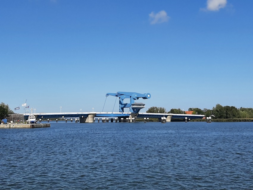 Im Hintergrund die Peenebrücke, über die auch die Züge fahren. Die Brücke verbindet die Insel Usedom mit der
