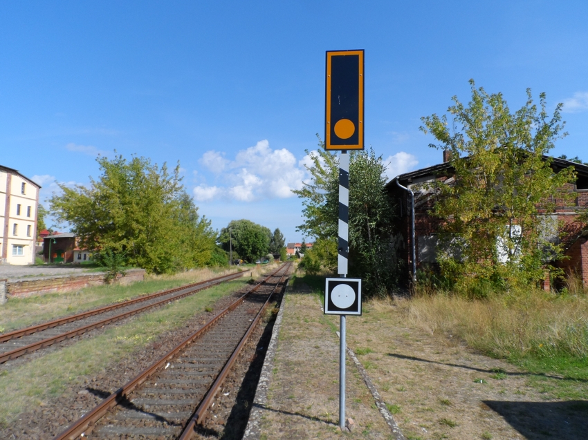 Richtung Karow zeigen noch Halt erwarten an. Im Hintergrund ist das ehemalige Stellwerk W1 zu sehen, das bis zur Umrüstung der Sicherungstechnik auf elektromechanisch mit Gleisbildpult in Betrieb war. Ungefähr Anfang oder Mitte der 2010er Jahre hat es endlich einen neuen Eigentümer gefunden. |