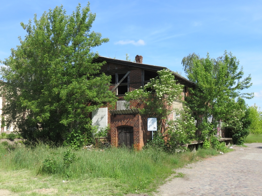 | ..., der inzwischen fast zugwachsen ist. Einige Fahchwerkausmauerungen fehlen leider auch schon. Bevor er einstürzt, wird er wohl auch abgerissen (wie in Plau). |