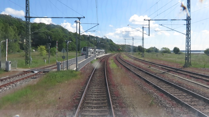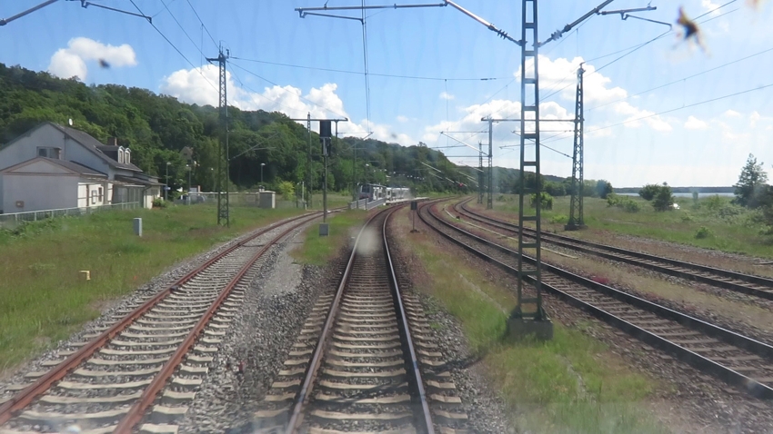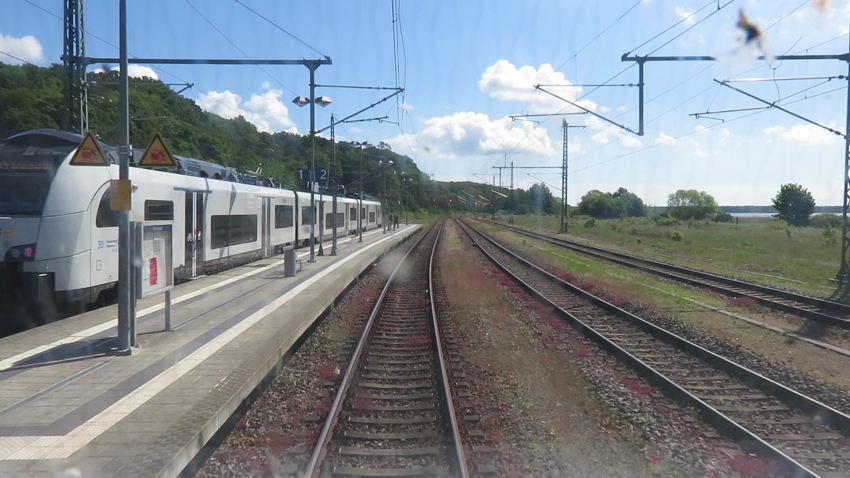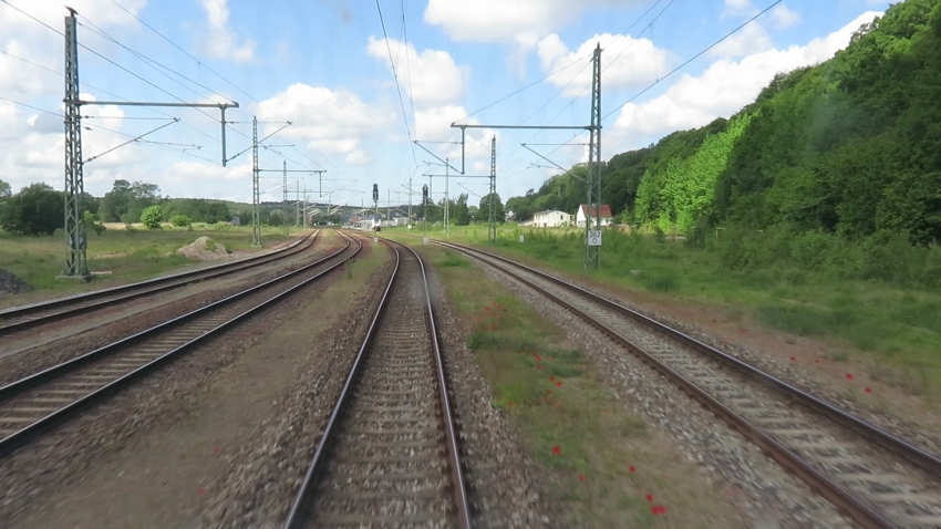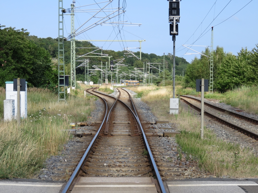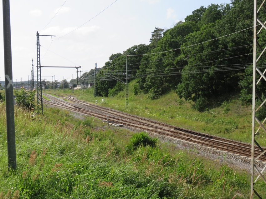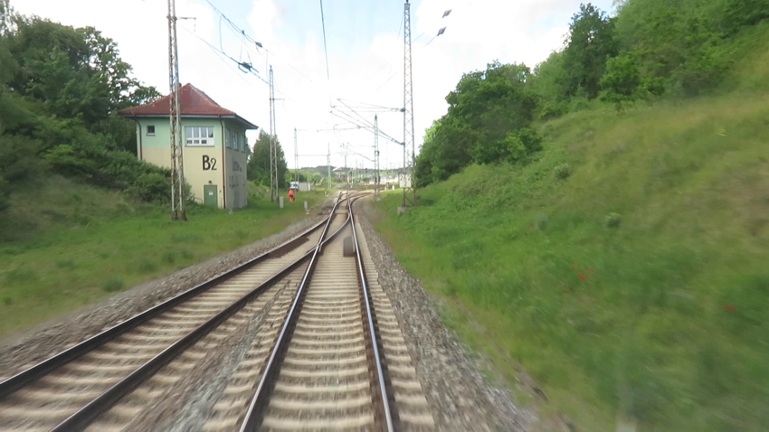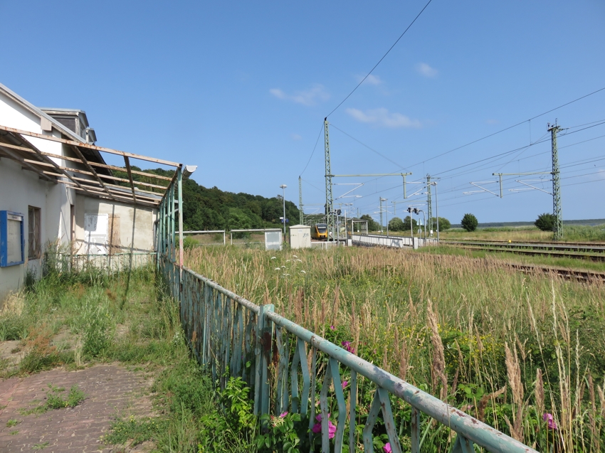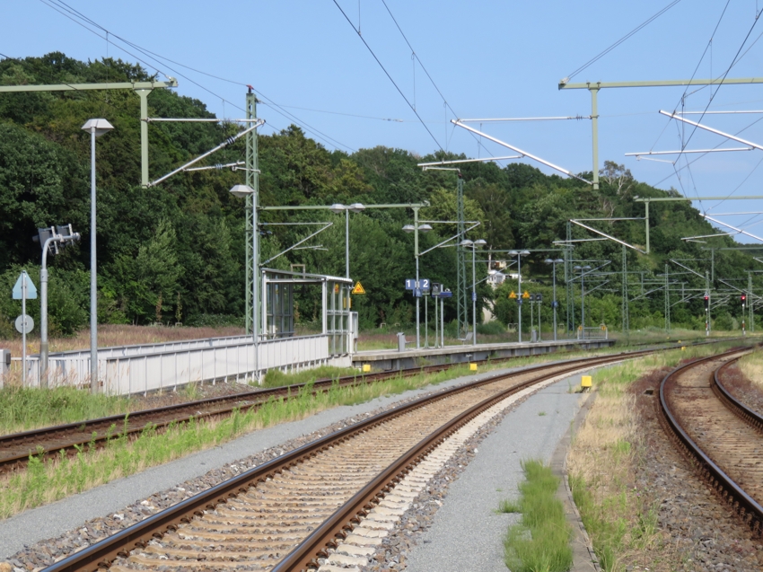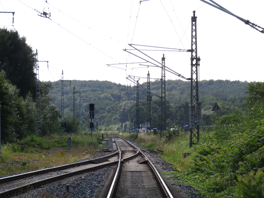 wieder auf: links nach Sassnitz, rechts nach Binz. Die erste Weiche ist abzweigend mit 60 km/h befahrbar, die zweite nur mit 40 km/h. Welch ein Unsinn, nur um ein paar Meter Gleis und ein paar Weichen zu sparen! Und so behindern sich die Züge oft gegenseitig. Aber so ist das, wenn nur Kaufleute das Sagen haben und nicht die Fachkräfte! |