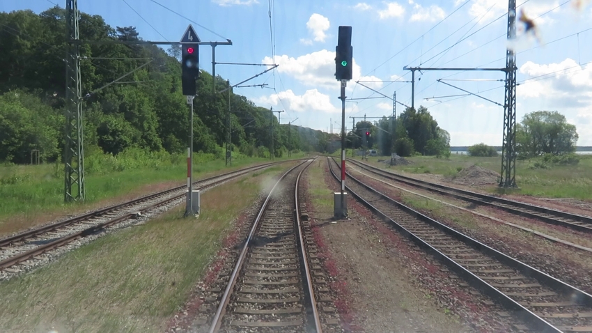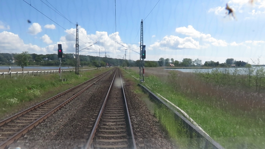 | Einfahrsignale aus Richtung Bergen kommend; links der Große Jasmunder Bodden, rechts der kleine Jasmunder Bodden |
