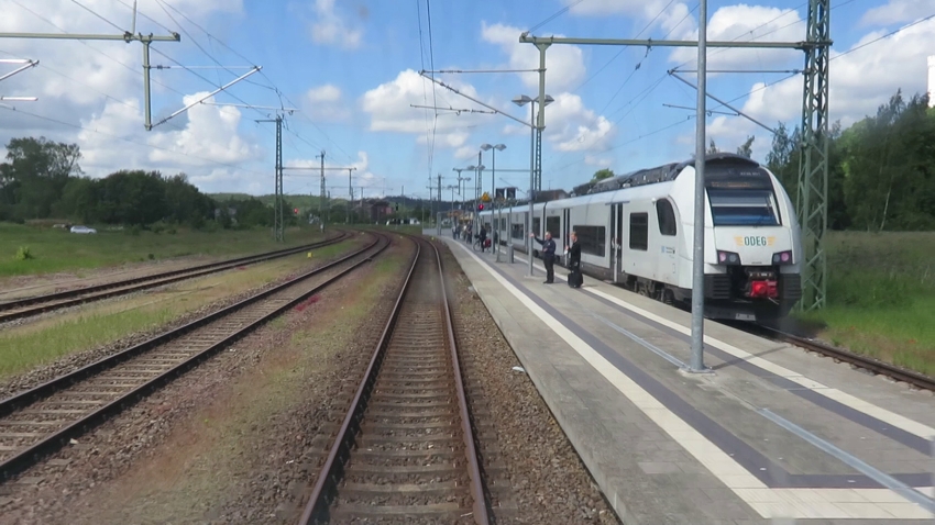 | Kurz vor dem Anhalten; rechts das ehemalige Stationsgebäude |