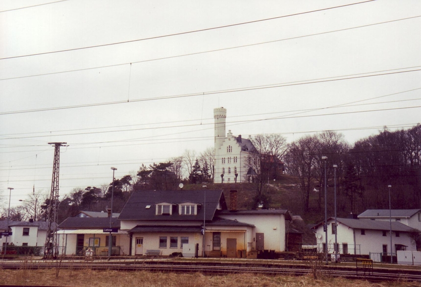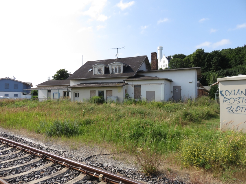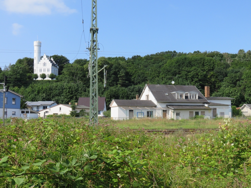 | Stationsgebäude mit Stellwerk W1; darüber am Hang das kleine Schlösschen. |