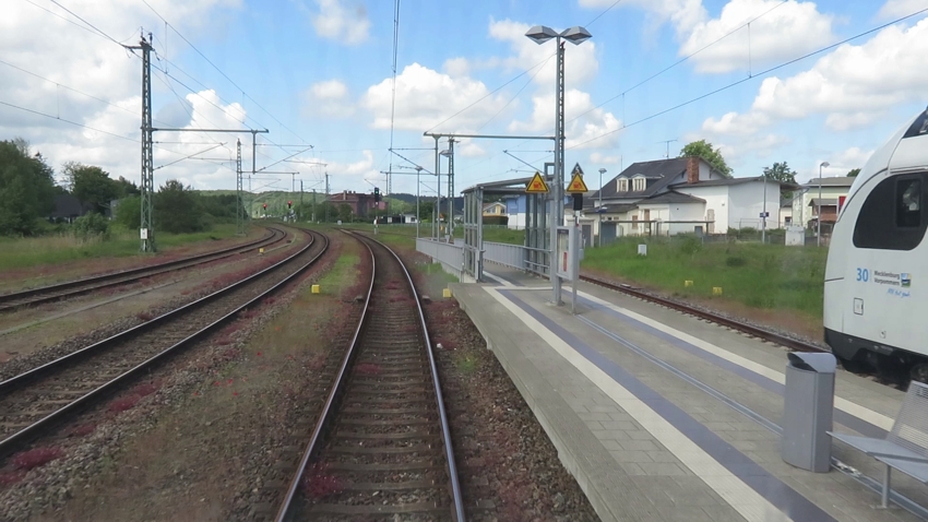 | kurz vor dem Bahnsteig; Der Zug auf dem Nachbargleis ist immer fü der Pendelzug Lietzow - Sassnitz/Binz. |