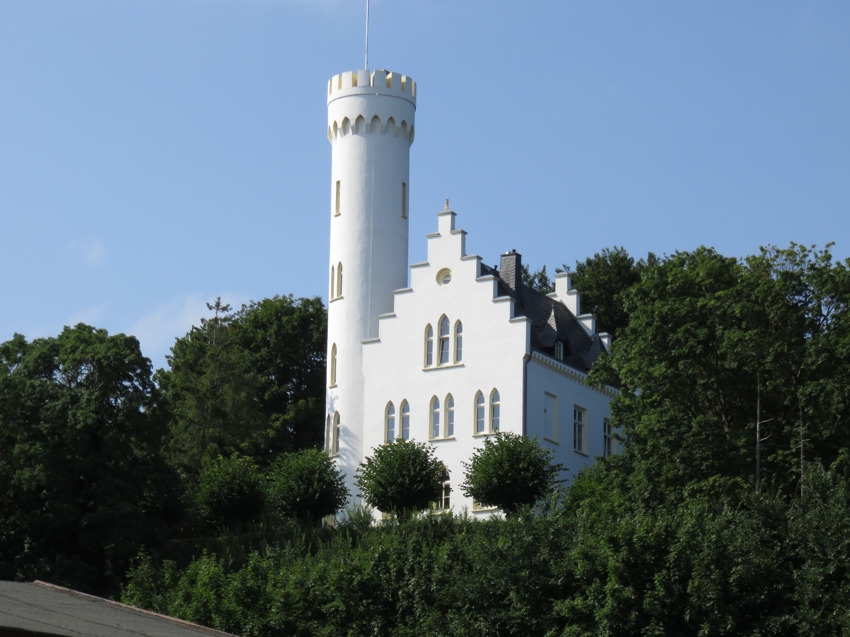 | links davon das auf einer Anhöhe stehende Schlösschen |
