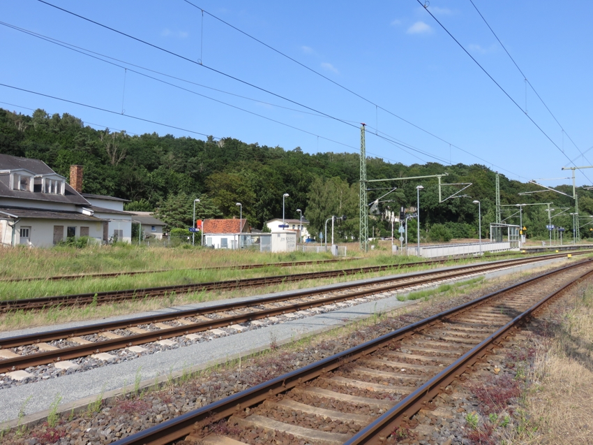 | Blick vom BÜ auf dem durchgehenden Hauptgleis 3 zum Bahnhof |