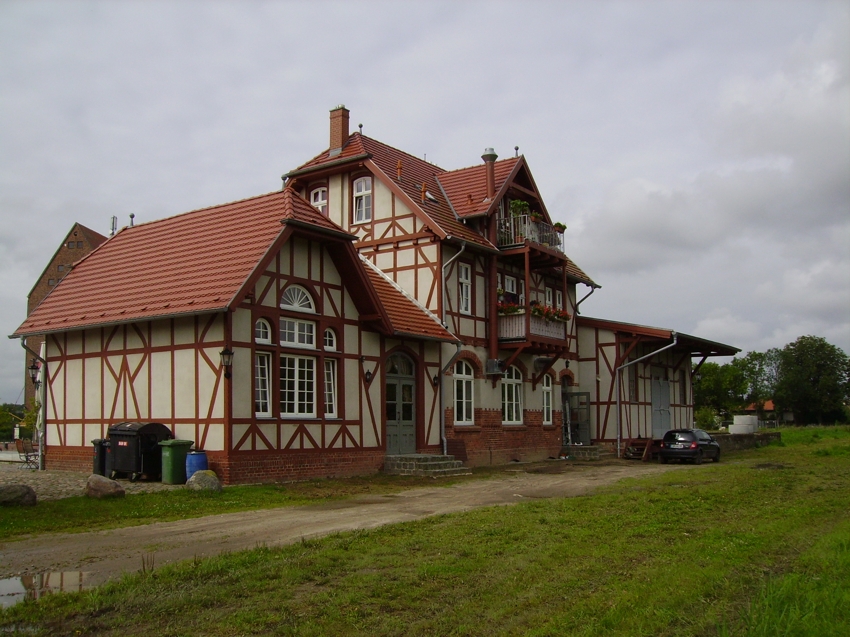 | Loitz ist eine Kleinstadt an der Peene südlich von Grimmen. Der ehemalige Bahnhof wurde vor mehreren Jahren von den neuen Eigentümern restauriert und ist heute ein Hotel mit Restaurant. |