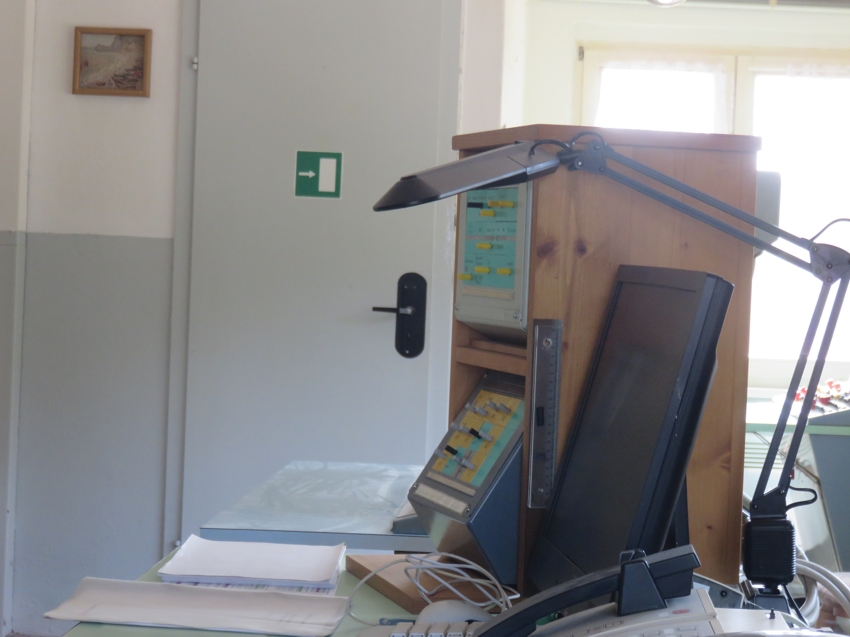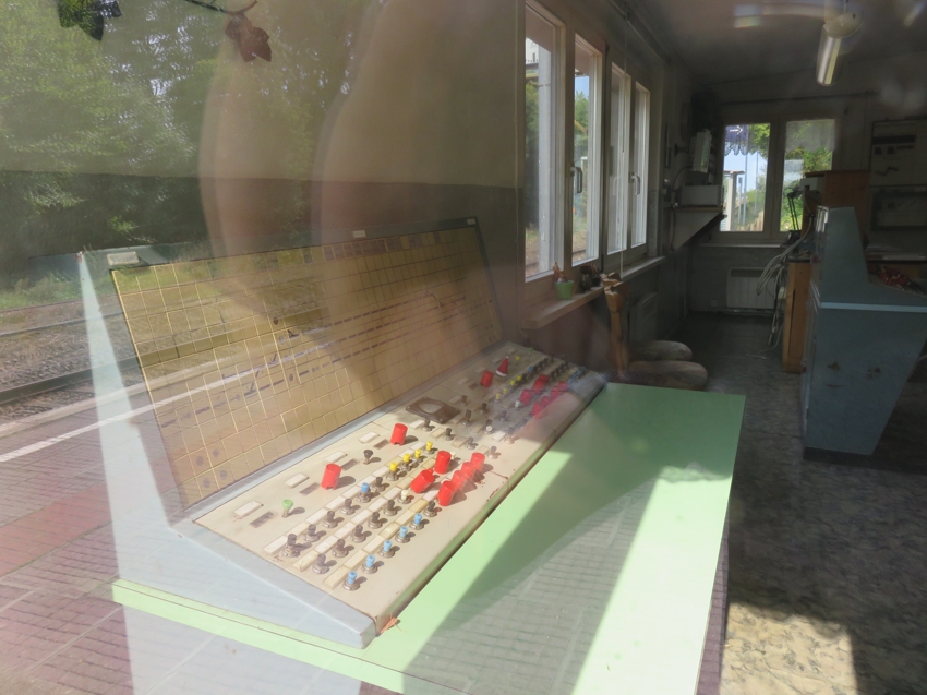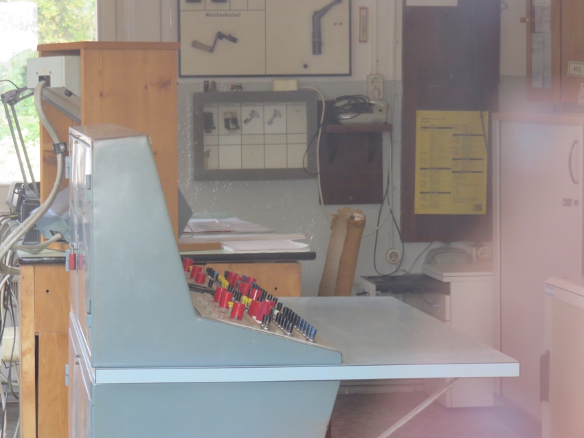| Ein Blick durch das Fenster des Stellwerksraumes zeigt noch das erhalten gebliebene Bedienpult des ehemaligen EZMG-Stellwerks [1], [2] (Importstellwerk aus der ehemaligen Sowjetunion für kleine bis mittlere Bahnhöfe). |
