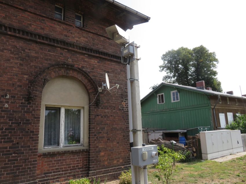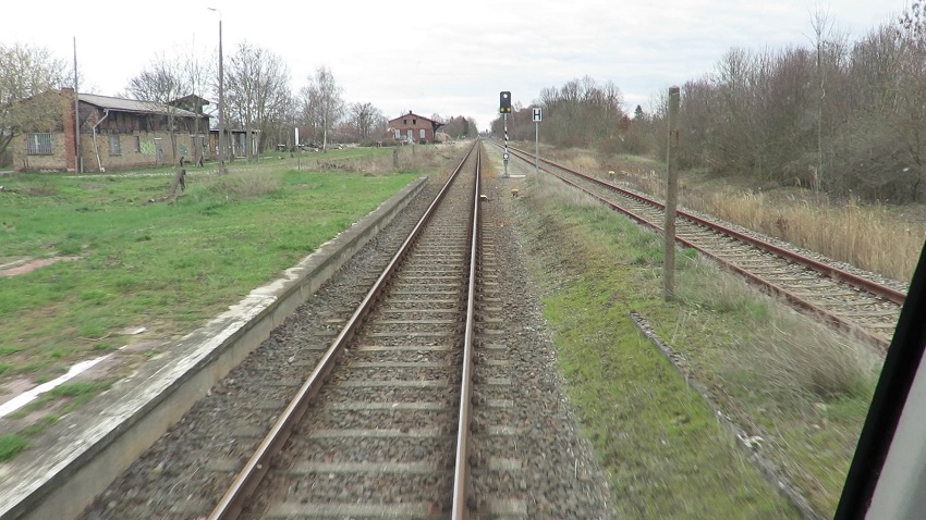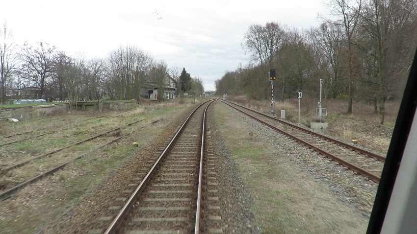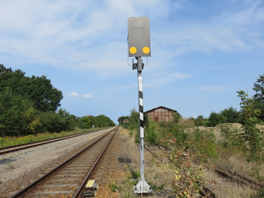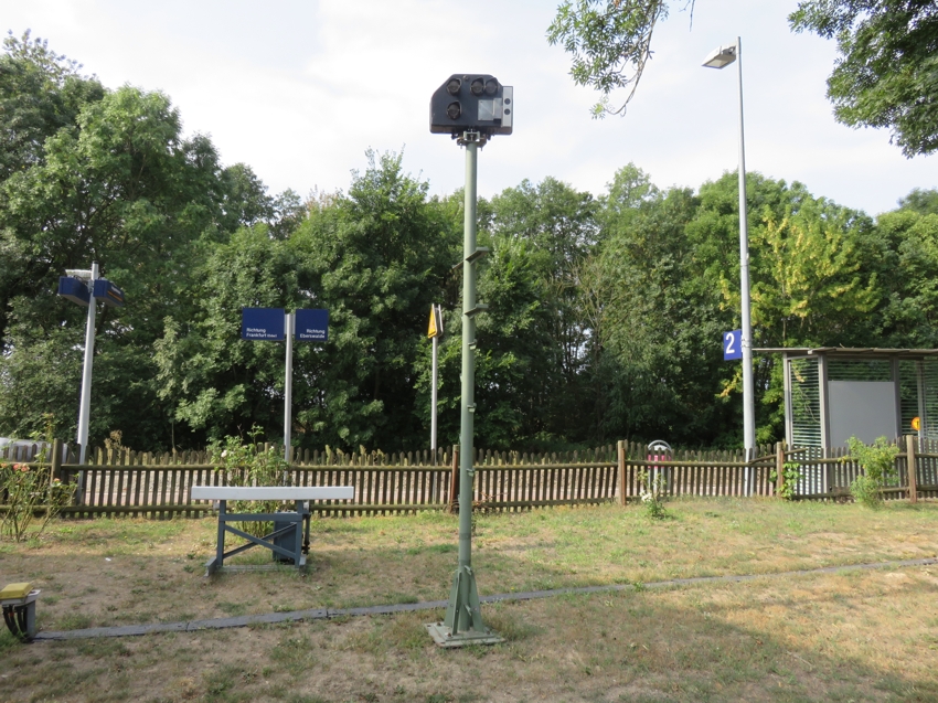 | Blick aus Richtung Werbig auf den Bahnhof; Im Vordergrund das Überwachungssignal