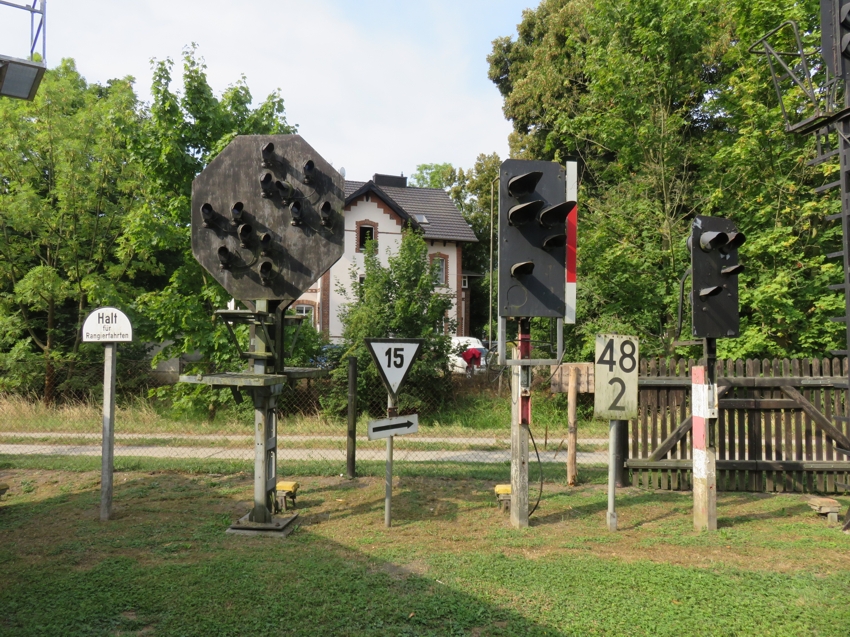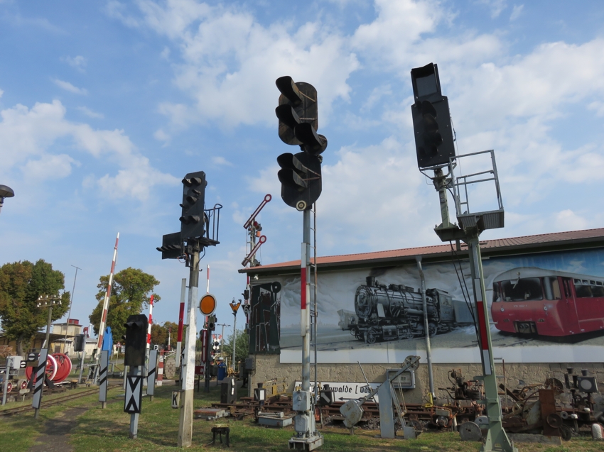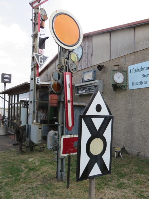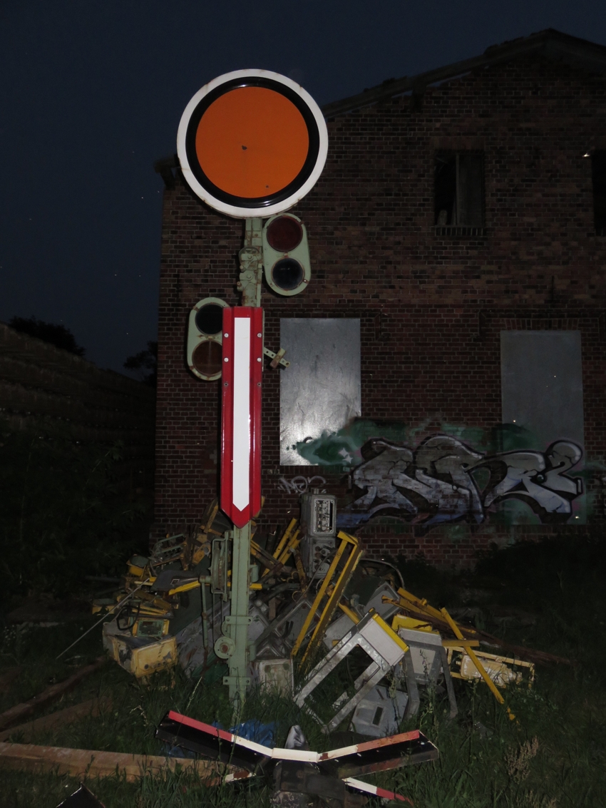 | Vor dem Güterboden liegen noch Reste der abgebauten EZMG-Signale und warten auf eine Aufarbeitung und neue Verwendung - vielleicht im Museum. |