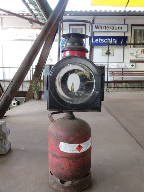 | Propangasflasche mit Signallaterne; Auf die Düse wird noch ein sog. Glühstrumpf gesteckt und dann angezündet. Nach 4 Wochen muss die Gasflasche gewechselt werden. |