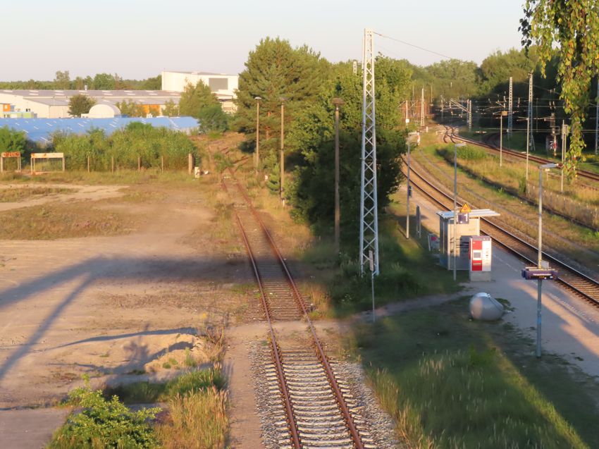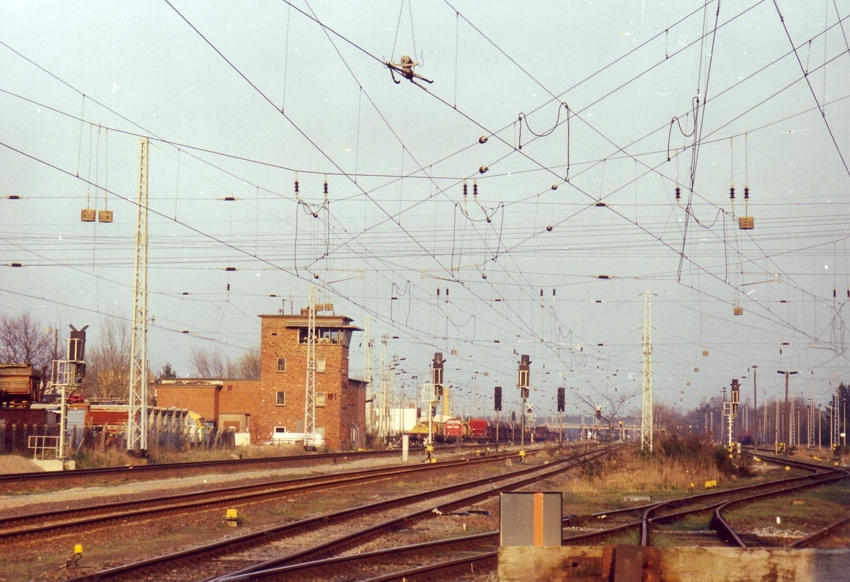 errichtet, das es heute natürlich nicht mehr gibt. | Kohlezüge wurden von den damaligen Bahnhofsgleisen 30,40 und 41 in den Anschluss rangiert und dort an einem Bunker mittels Portalkran entladen.   | ![]() Blick in Richtung Güstrow |   | ![]() das ehemalige Stellwerk |   | externe Bilder: |